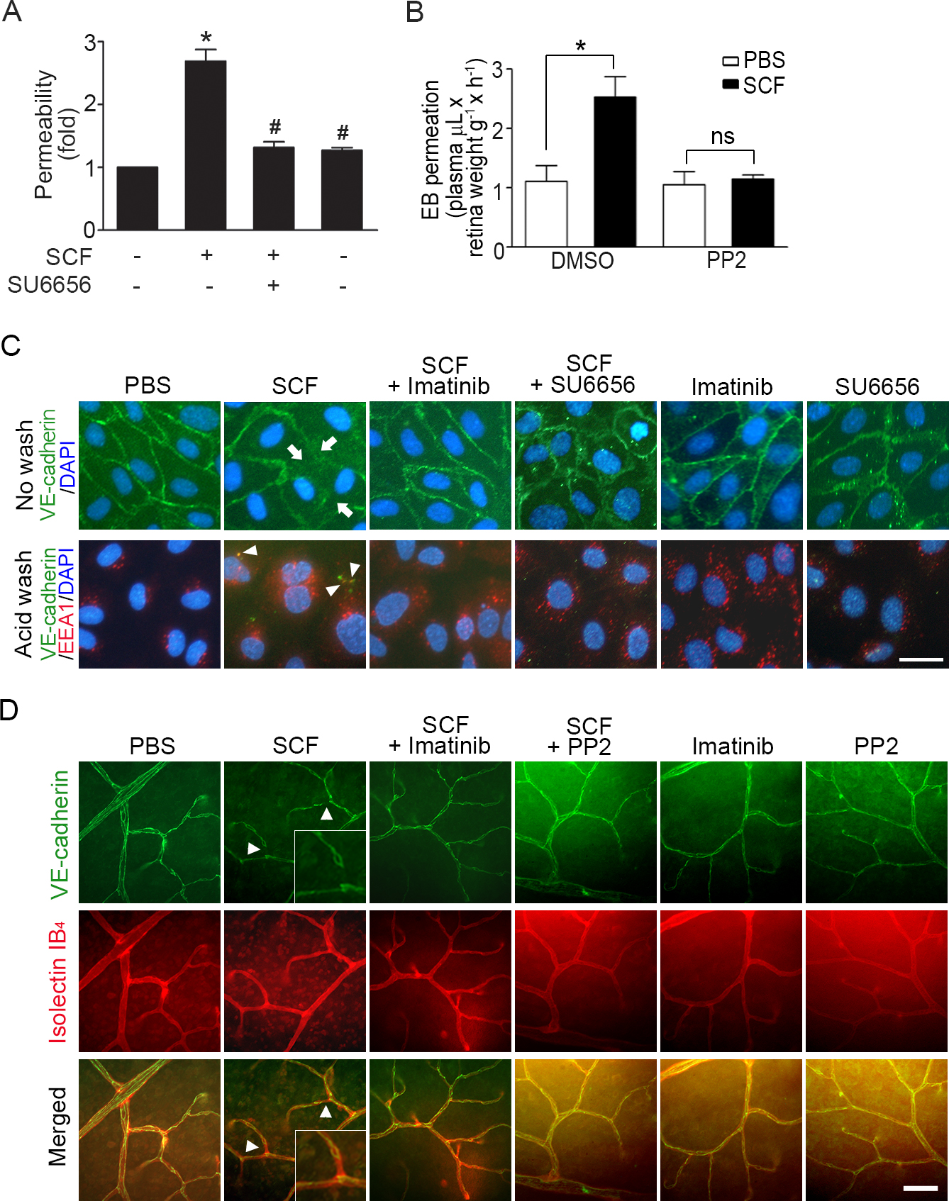 into each eye (*p<0.05, ns = not significant, n = 5). C–D: Src inhibitor blocks SCF-induced internalization of vascular endothelial (VE)-cadherin. In C, HRMECs were pretreated with SU6656 (1 μM) or imatinib mesylate (10 μM) for 30 min before the stimulation with rh SCF (50