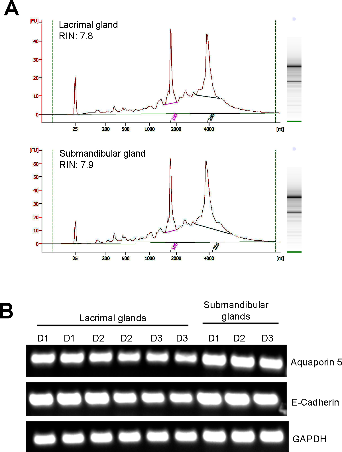 gland (SMG) tissue from three donors (D1, D2, and D3) and used to investigate RNA integrity. A: Representative Bioanalyzer 2100 traces from human LG and SMG total RNA depicting high RNA integrity number (RIN) values.