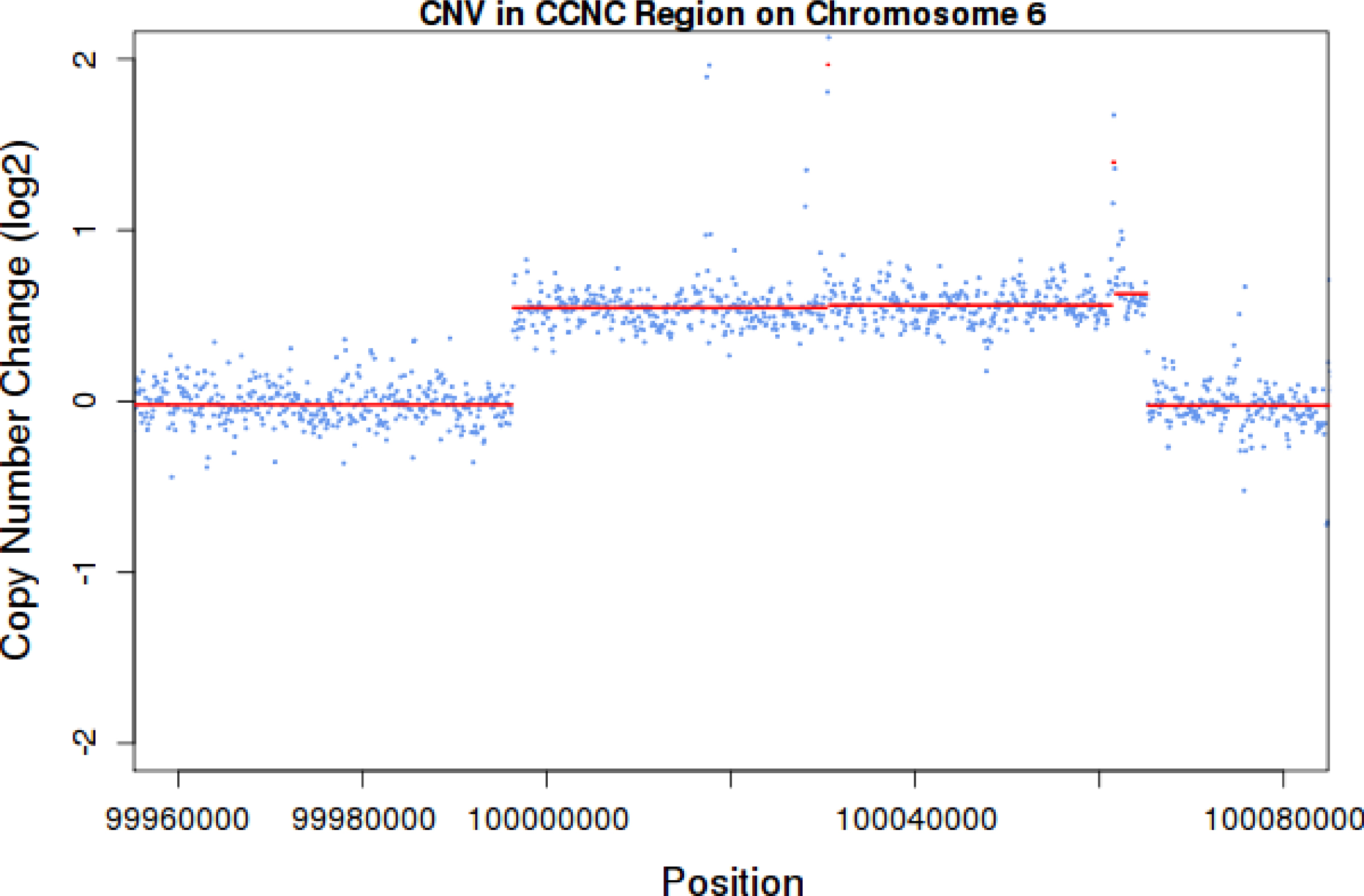 Figure 4. CNV detection of chromosome 6q duplication. Copy number change in the CCNC-PRDM13 regions for affected individuals (n = 3) relative to unaffected individuals (n = 2), as computed by the log2 ratio of the