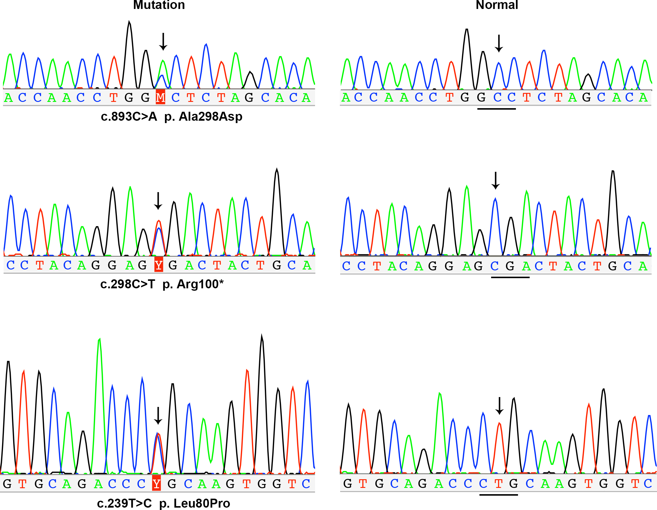left, whereas the corresponding normal sequences from controls are shown on the right. Arrows indicate the sites with and