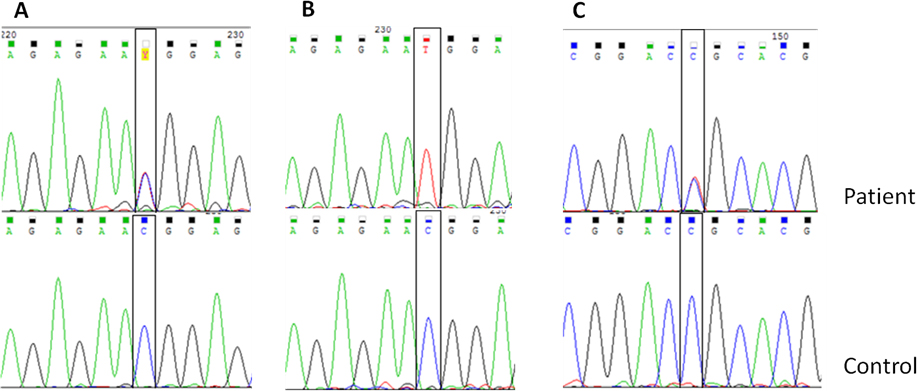 Figure 2. Sequencing chromatograms of variations in TGFBI identified in this study. A: The c.1663 C>T (p. R555W) variation (heterozygote) in granular corneal dystrophy type 1 (GCD1). B: The c.1663 C>T (p. R555W) variation (homozygote) in GCD1. C: The c.370 T>C (p. R124C) variation (heterozygote) in lattice corneal dystrophy type 1 (LCD1).