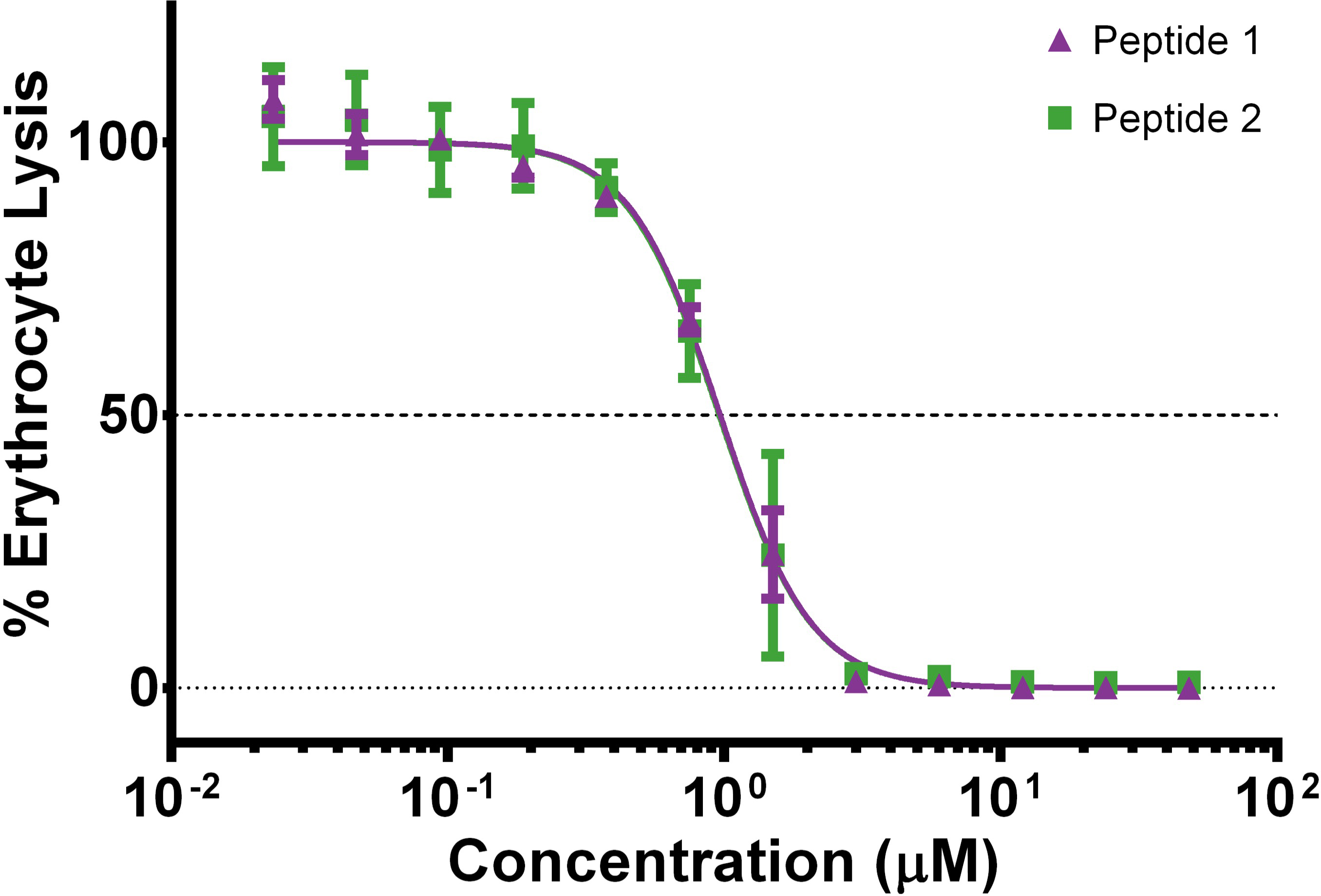 curve at the IC50. Peptide 1 is the parent peptide (positive control), and Peptide 2 is the PEGylated form of the parent peptide.