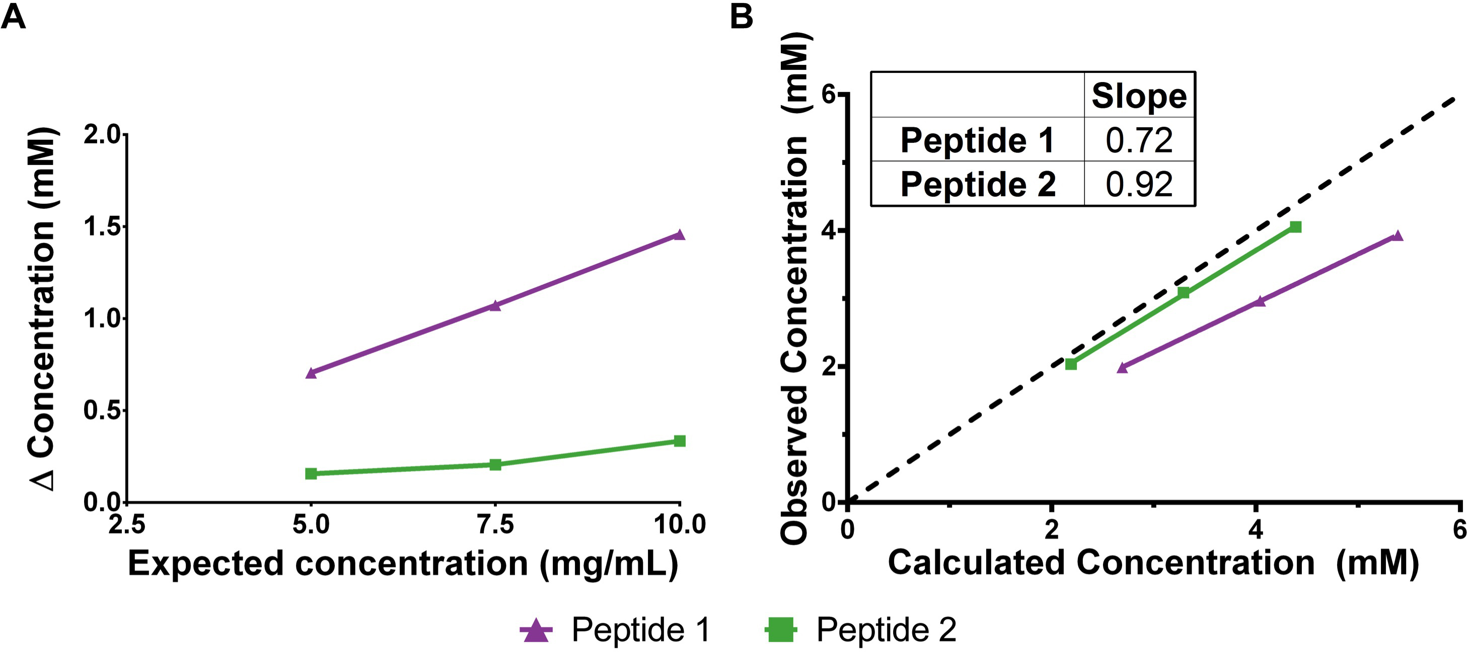 and remains nearly constant in the dilution series. B: Correlation of the observed concentration with the calculated concentration, with the concentrations presented in mM. Peptide