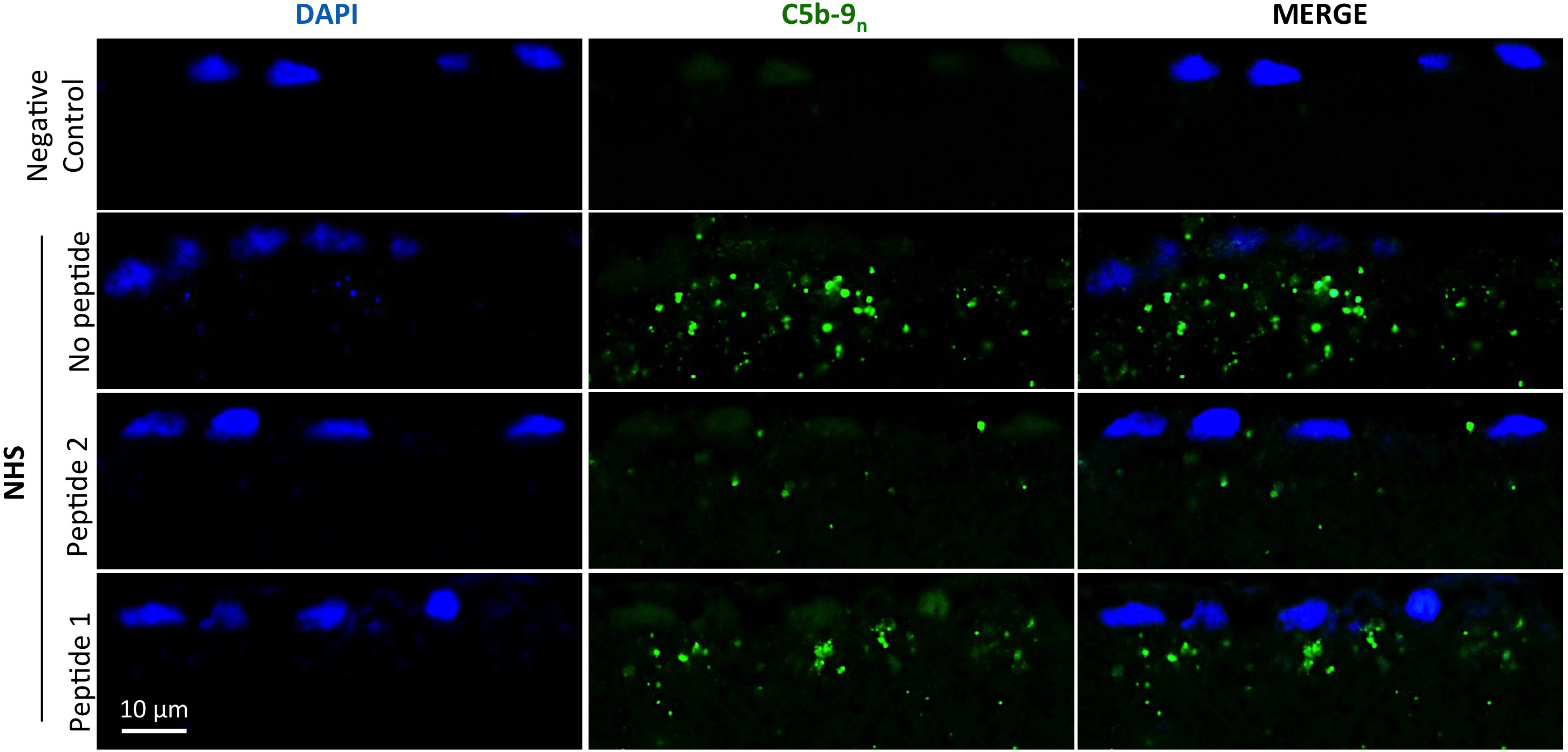 Figure 3. Human RPE cells form basal deposits rich in C5b-9n (MAC) in vitro, and inhibitory effects of compstatin peptides. Representative cross-sectional images show 3-month-old RPE