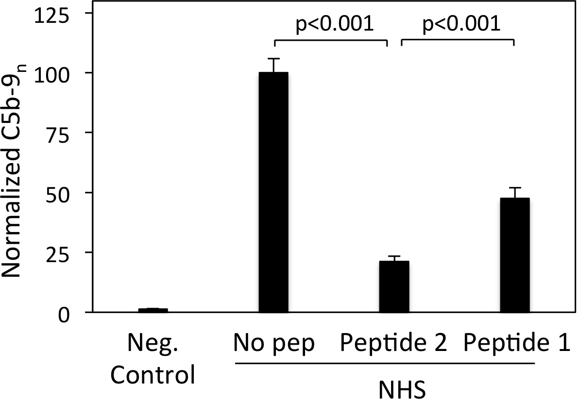 ± standard error of the mean (SEM). Data analyses show that Peptide 2 causes 80% reduction in NHS-induced basal C5b-9n deposition by RPE cells. Peptide 1 exhibits a weaker inhibitory effect, reducing C5b-9n deposition by 50%. Bars indicate mean ± SEM.