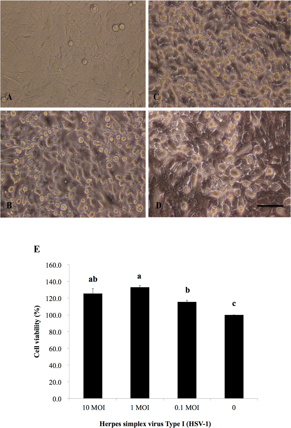 Seruminstitut rabbit corneal (SIRC) cells were uninfected (A) or infected with the indicated 0.1 (B), 1 (C), and 10 (D) MOI of herpes simplex virus type I (HSV-1). E: After 24 h, cell viability was measured with the Cell Counting Kit-8. Scale bar=10 μm. Bars are mean ± standard error of