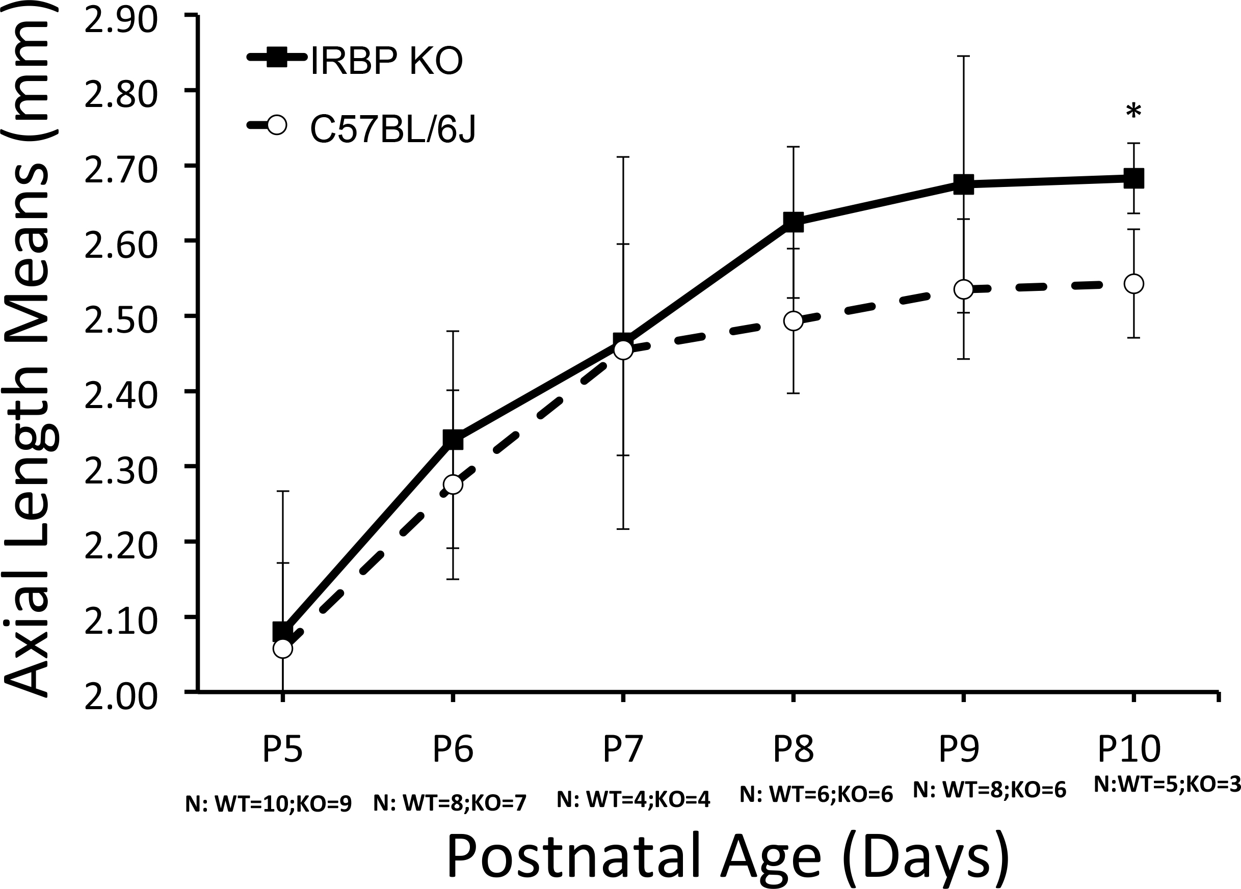 Figure 3. Axial length compared between IRBP KO and WT mice. From P5 to P10, we compared axial length. Axial length was measured with