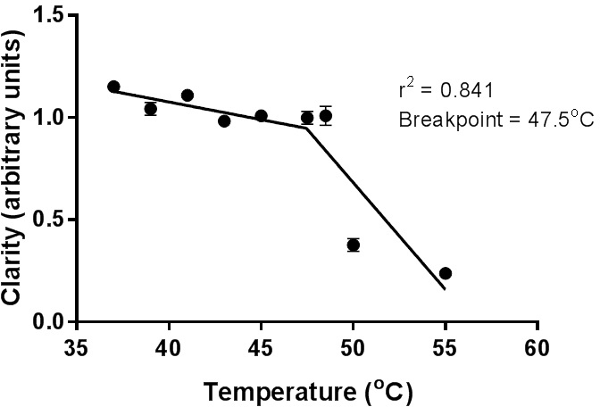 of clarity (n = 6 at all temperatures with the exception of n = 3 and n = 4 at 47.5 °C and 48 °C, respectively). All data
