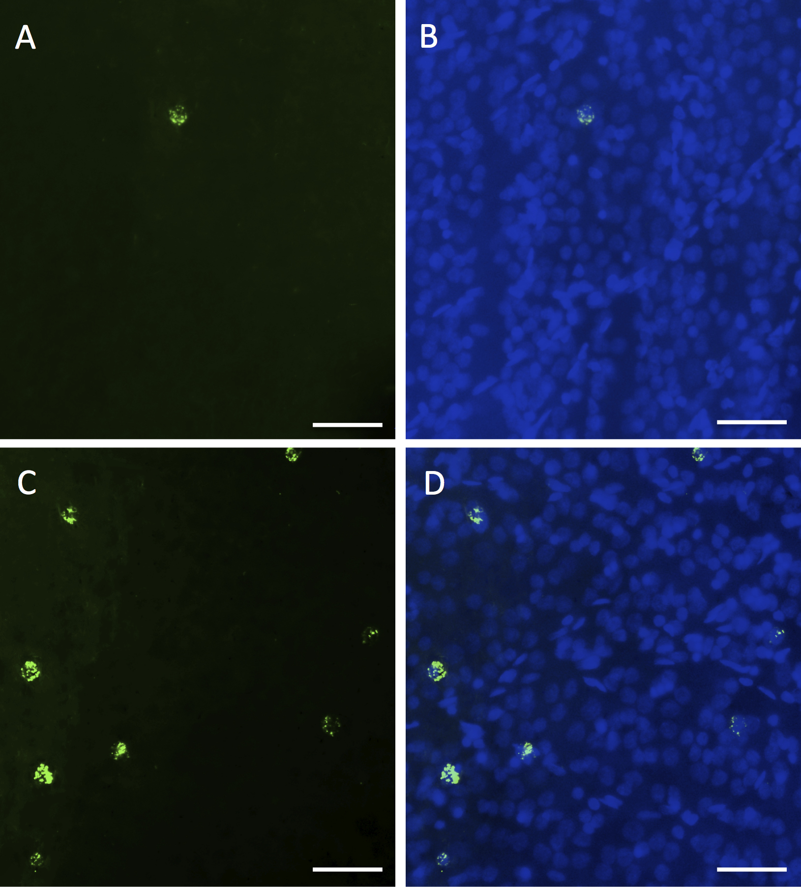 5 µl). Apoptotic retinal ganglion cells labeled with intravitreal annexin V-fluorescein isothiocyanate (FITC) (A–C) or annexin V-FITC and 4',6-diamidino-2-phenylindole (DAPI) (B–D) before the animals were euthanized. A, B: Control eye (NaCl 0.9%, 5 µl). C, D: Eye treated with intravitreal recombinant tissue plasminogen activator (rtPA; 2.16 µg/5 µl) displaying a higher number of
