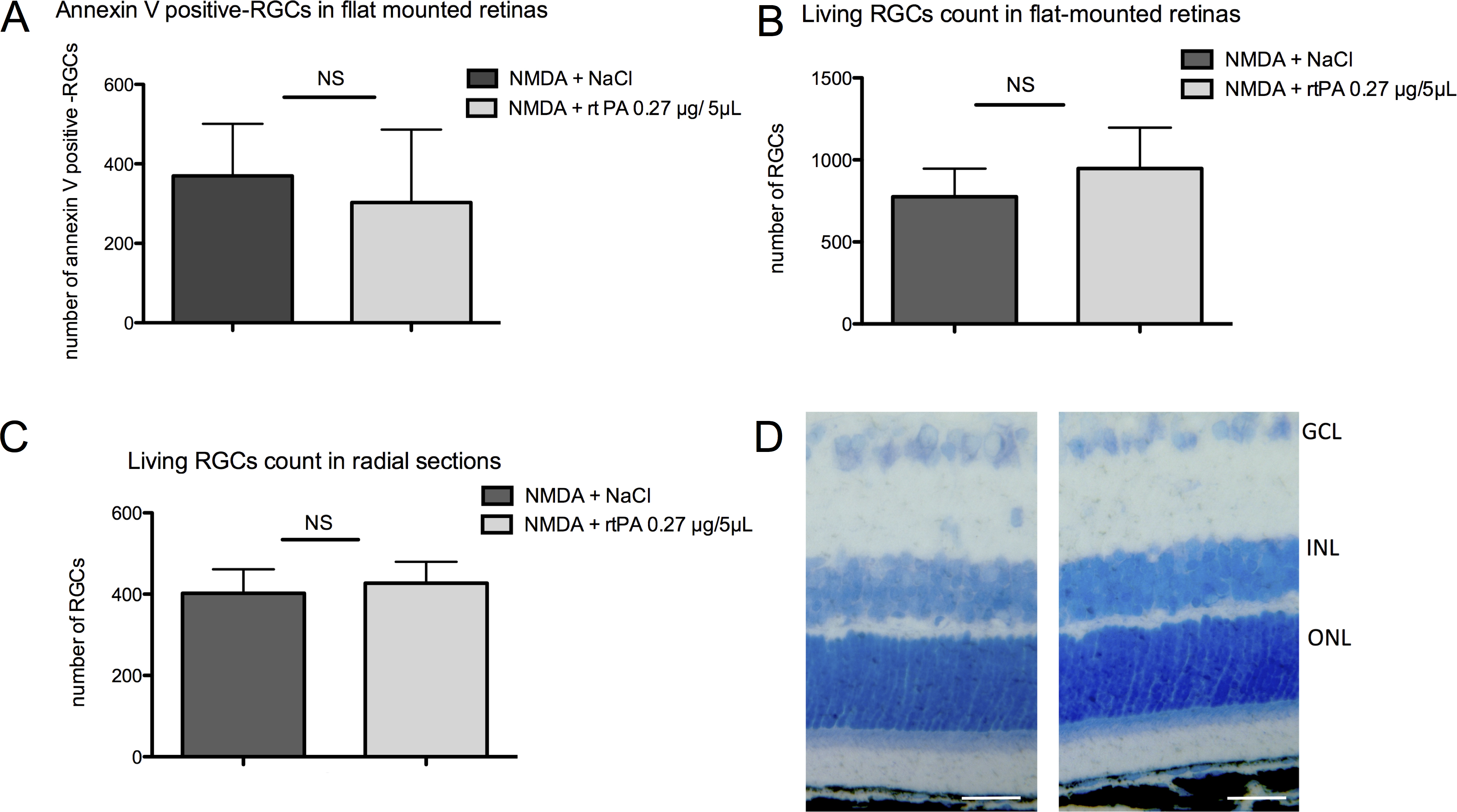 activator (rtPA; 0.27 µg/5 µl). A: Number of annexin V-positive retinal ganglion cells quantified on flatmounted retinas, showing no difference between the