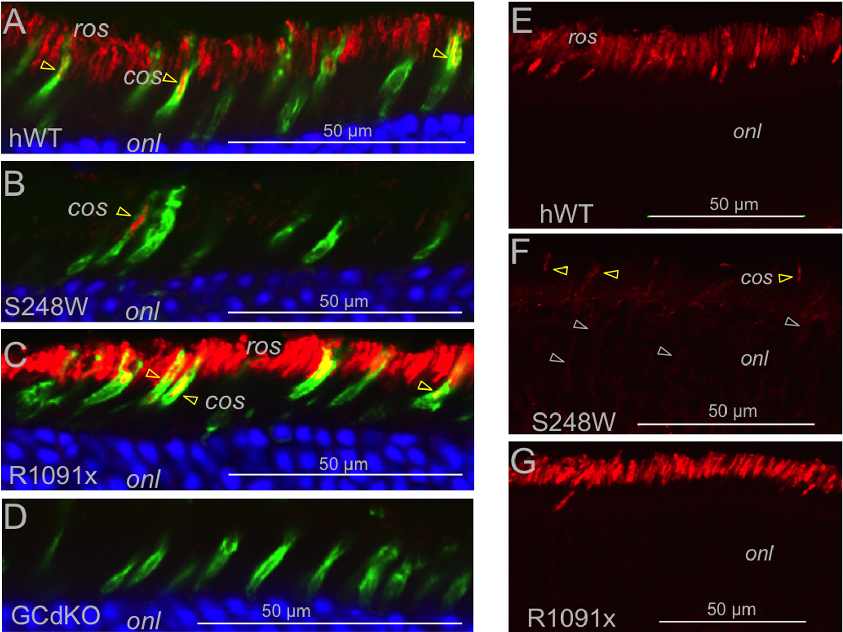 In all panels, the anti-RetGC1 fluorescence was recorded in the same experiment using identical laser settings. E–G: RetGC1 immunostaining in wild-type (E), S248W (F), and R1091x (G) GUCY2D-expressing retinas shown at lower magnification. Note the faint S248W GUCY2D immunofluorescence in the photoreceptor