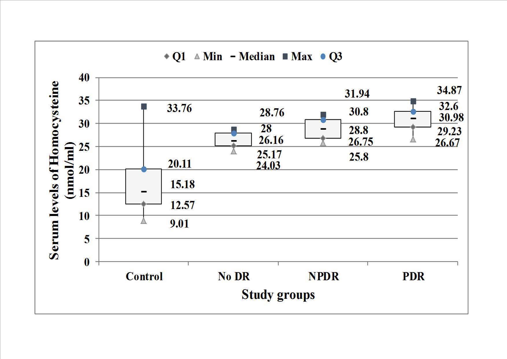 and the whiskers indicate the highest and lowest values. An increase in serum level of homocysteine with increase in severity