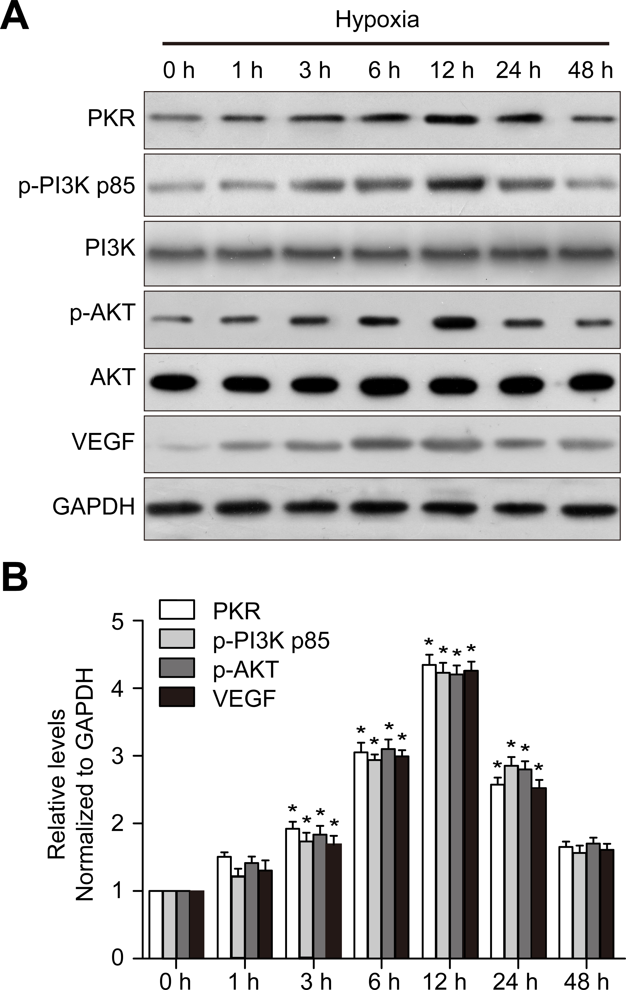 B (p-AKT), and vascular endothelial growth factor (VEGF) expression. B: The histogram shows the densitometric analysis of the average levels of PKR, p-PI3K, p-Akt, and VEGF to GAPDH. *p<0.05 compared