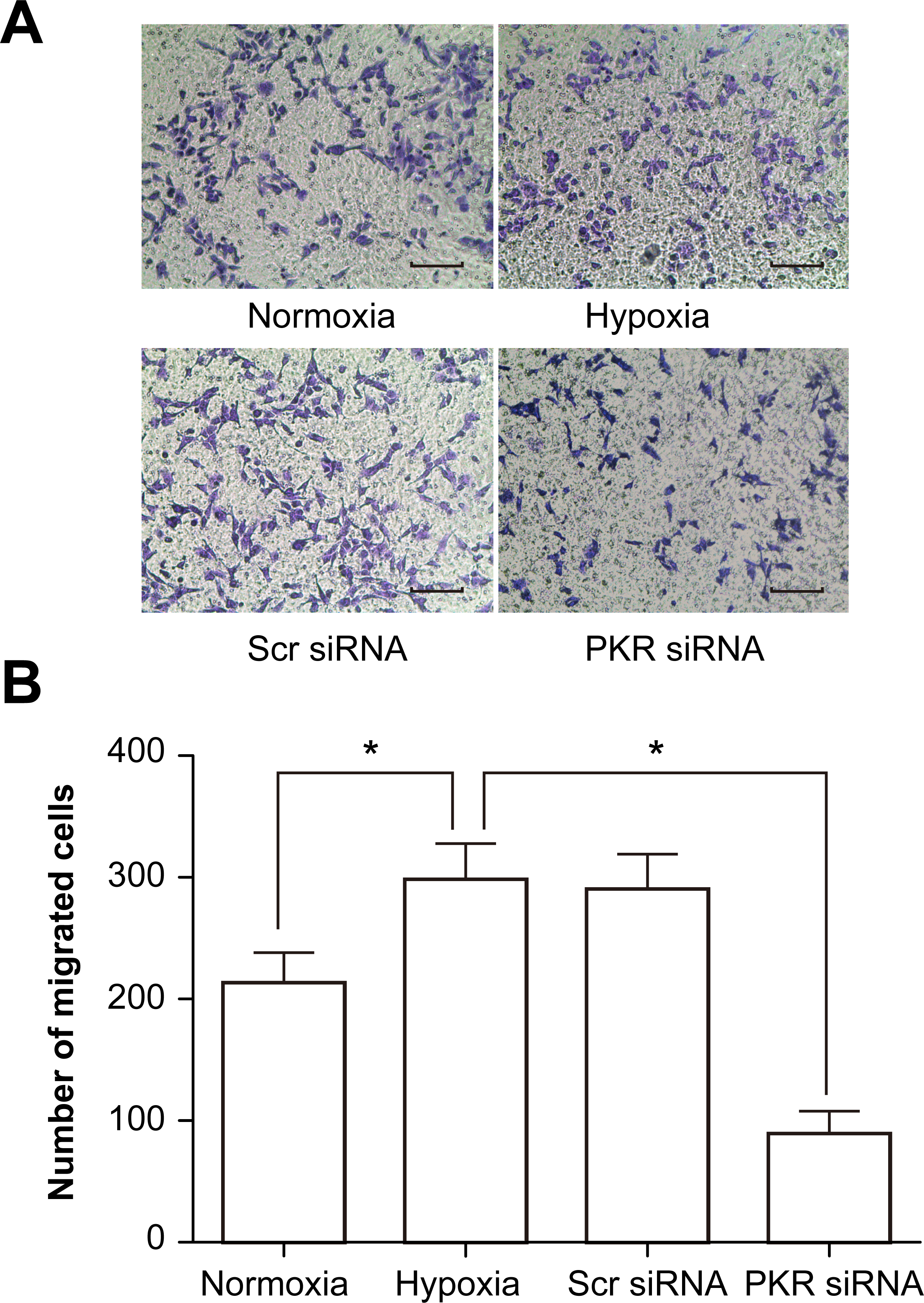 protein kinase (PKR) siRNA. Representative photographs of migrated RF/6A cells (200× magnification). B: The average number of migrated RF/6A cells per field. *p<0.01, PKR siRNA group versus the hypoxic group. Values represent