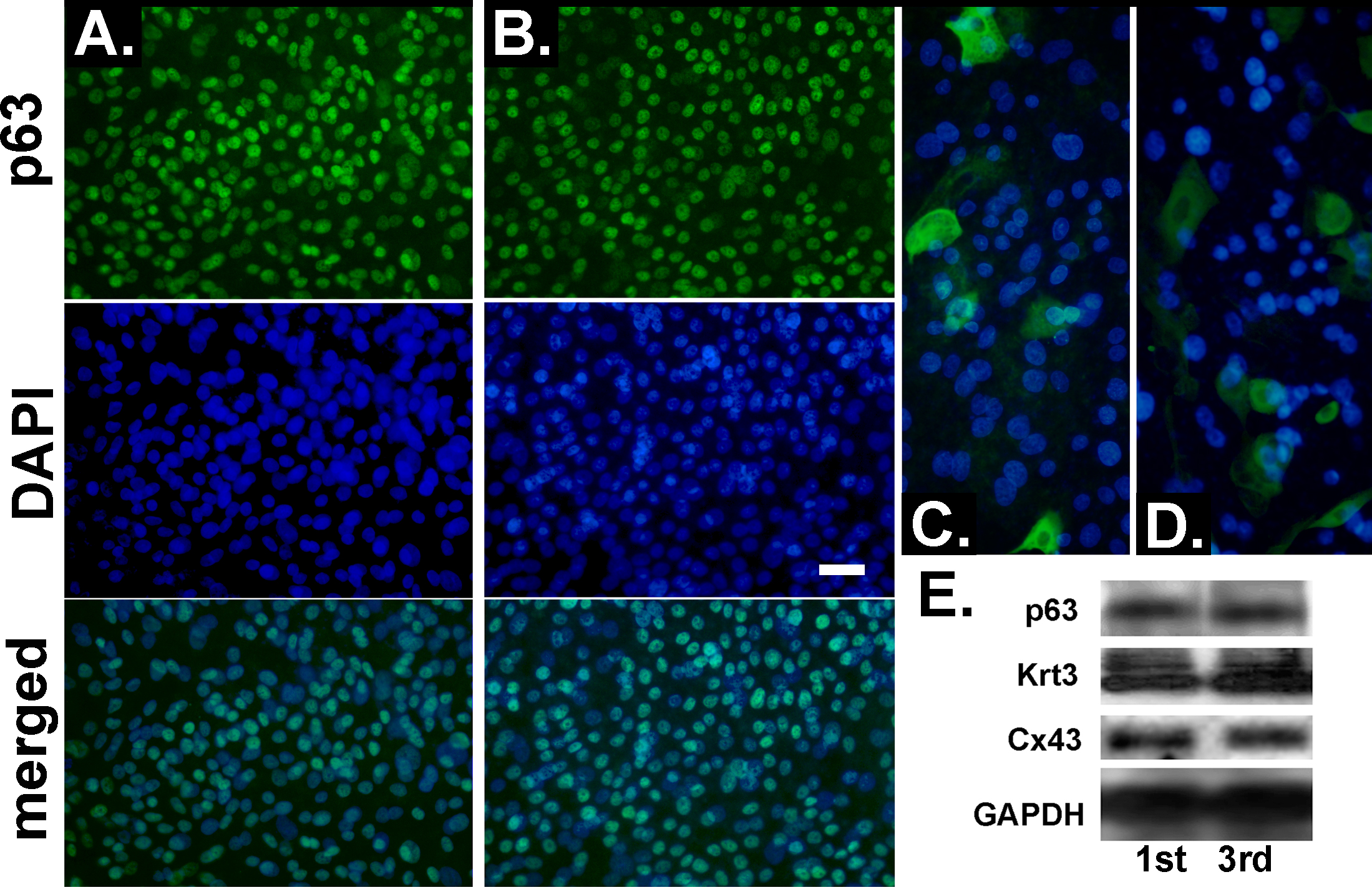 Figure 2. Comparison of growth and differentiation markers in primary- and tertiary-generation explant outgrowths. A and B: p63 immunostaining. C and D: Krt3 immunostaining. A and C: Primary cultures. B and D: Tertiary-generation cultures. E: Western blots. Targets and culture generations are indicated. Bar equals 50 µm in A and B and 33 µm in C and D.