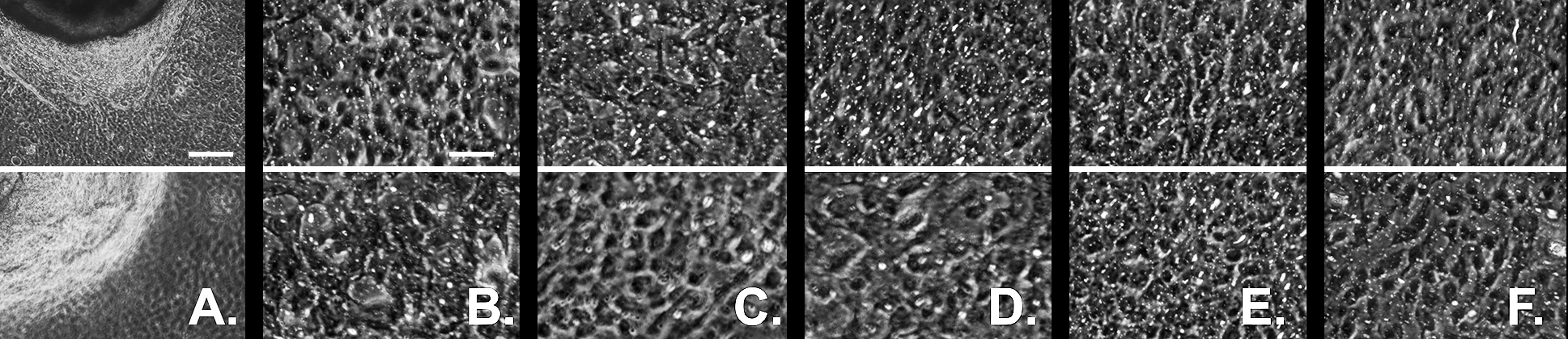 (bottom). C–F: Equivalent micrograph pair from a secondary outgrowth-based regeneration (C) and from three tertiary outgrowth-based regenerations (D–F). The regularly distributed white puncta on these images arises from reflections of the 0.4 μm pore of the permeable substratum.