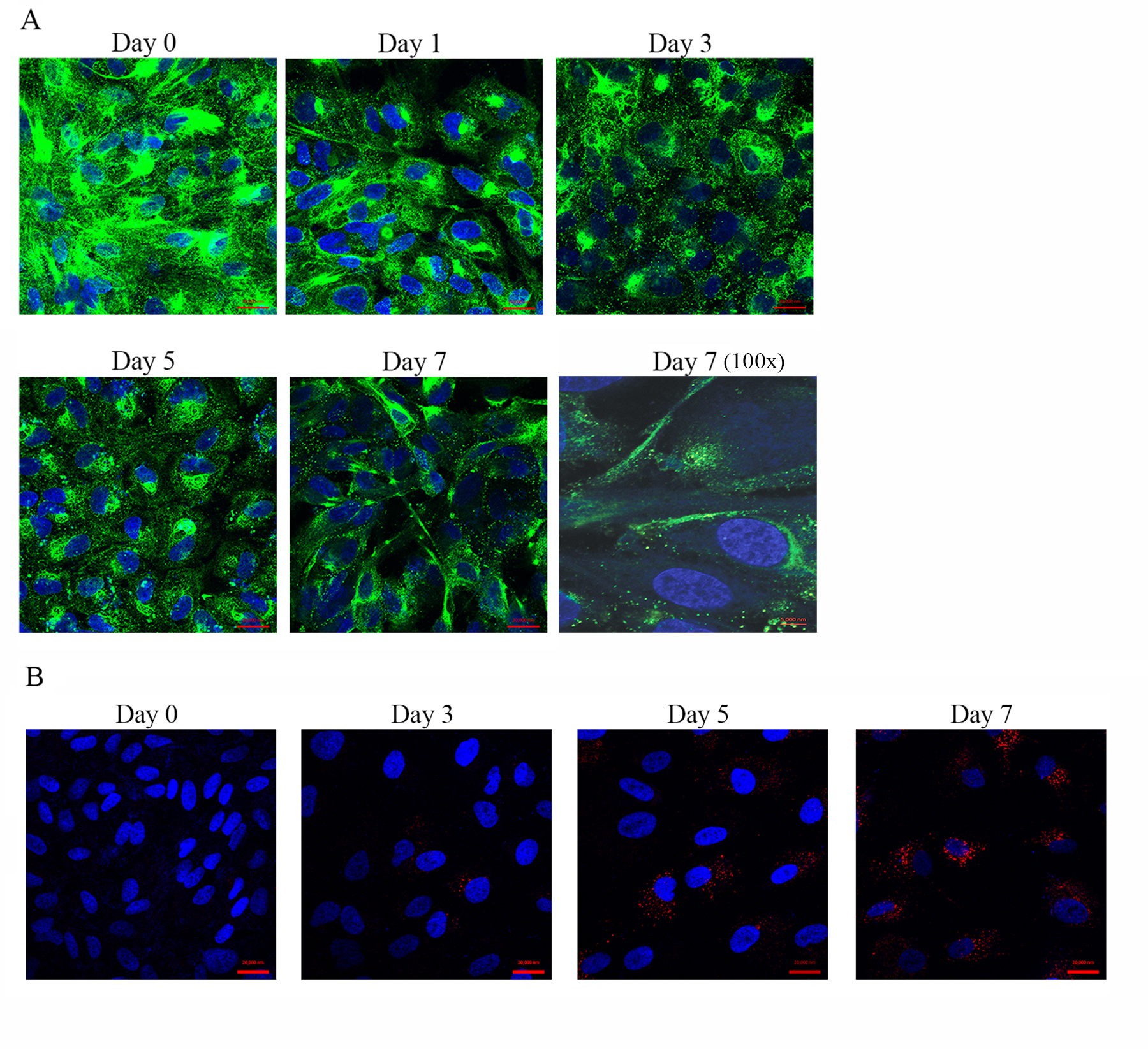 Figure 5. LDLR localization and LDL uptake in serum-deprived and -starved ARPE-19 cells. A: Immunofluorescence of cells in serum-free medium (SFM) from day 0–7. Low-density lipoprotein receptor (LDLR; green) is primarily