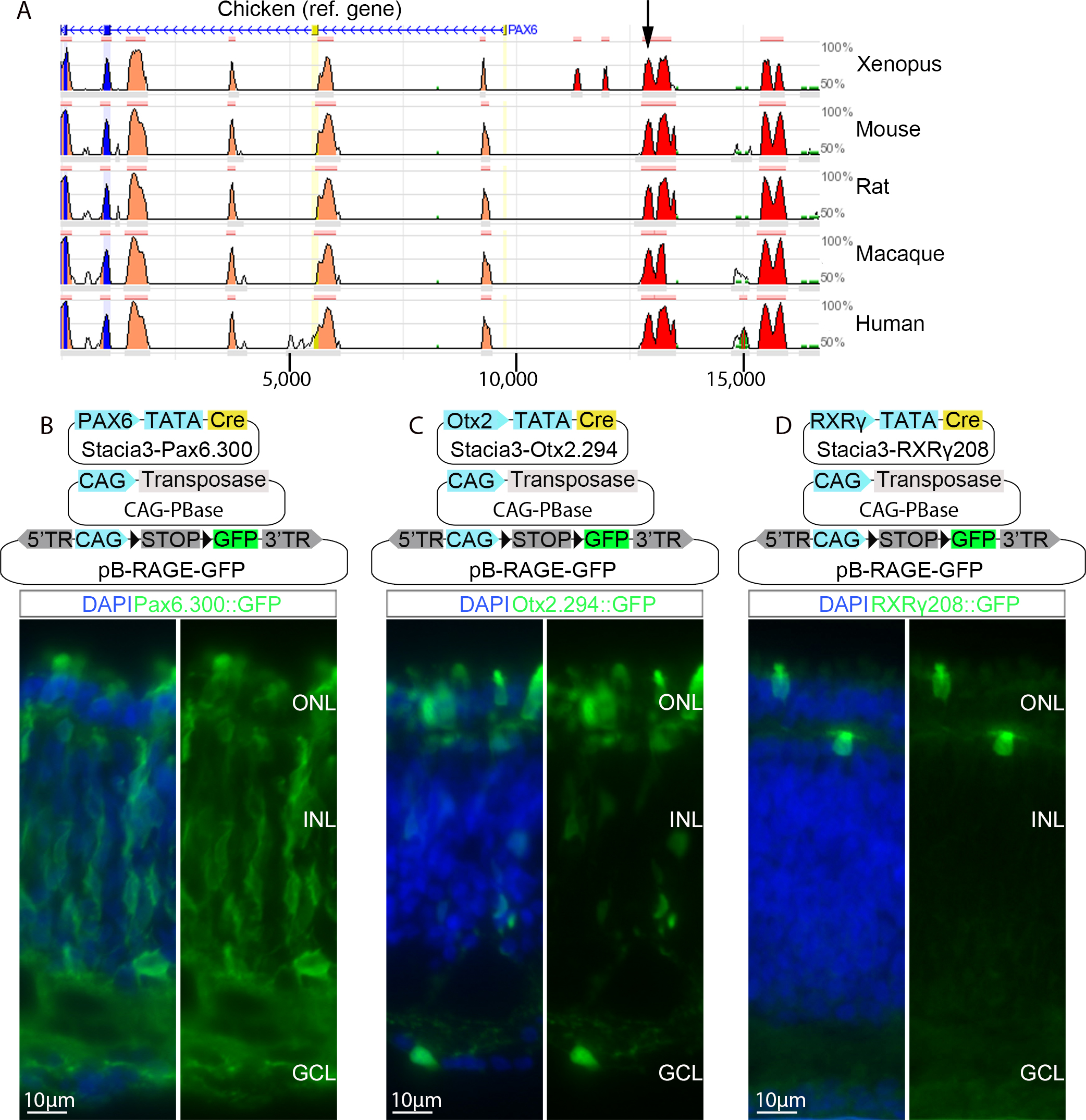 Figure 3. Assessment of the Pax6, Otx2, and RXRγ regulatory sequences in combination with the piggyBac integration system.