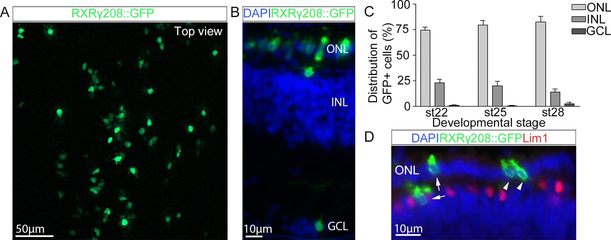 Figure 4. Activity of the RXRγ208 sequence produced specific reporter gene expression. A: Z-stacked confocal fluorescence micrograph of a flatmounted retina from a stage 40 embryo electroporated with the RXRγ208