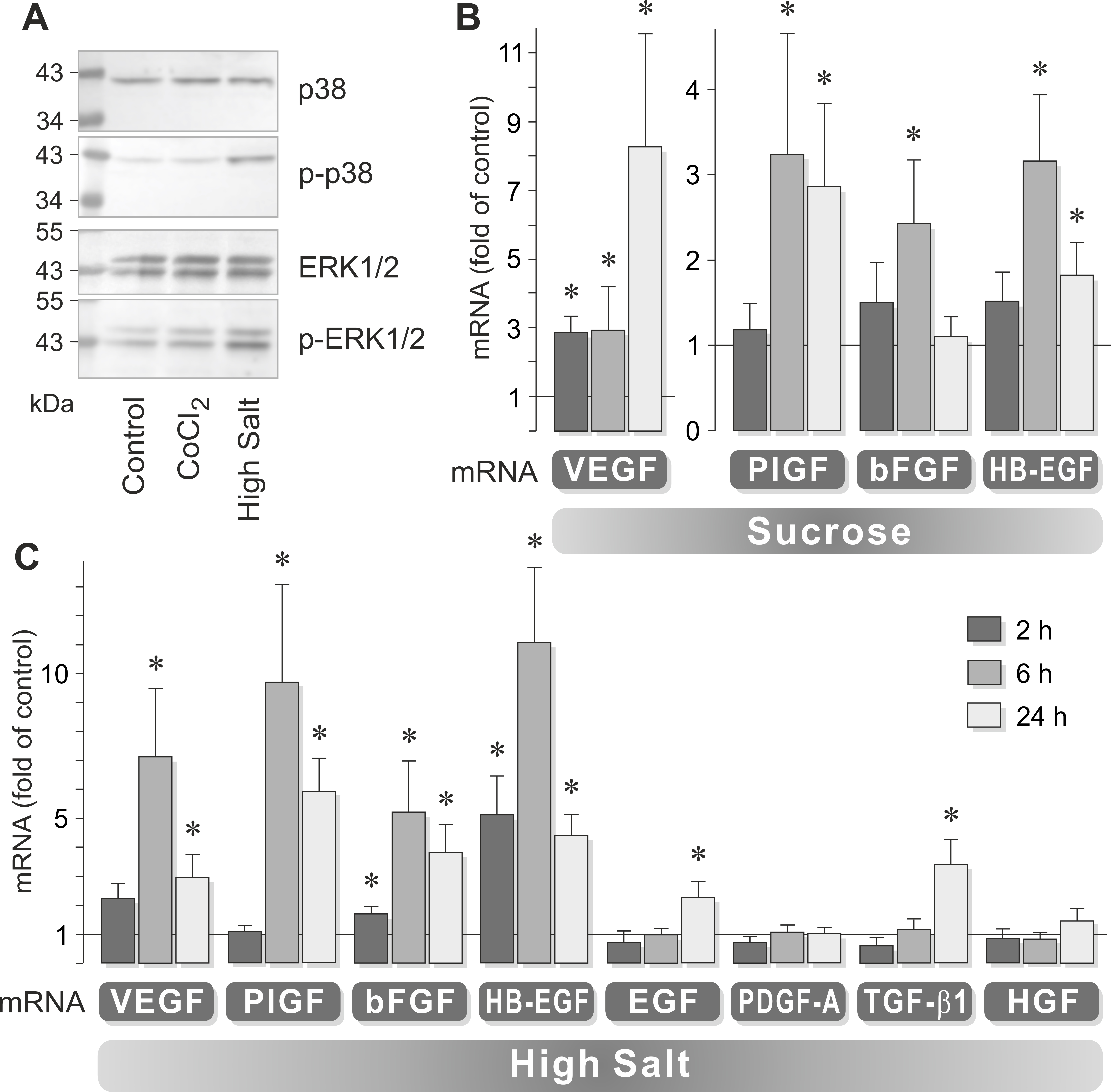 C: Relative mRNA levels of growth factors in cells cultured in media with high osmolality for 2, 6, and 24 h. High osmolality