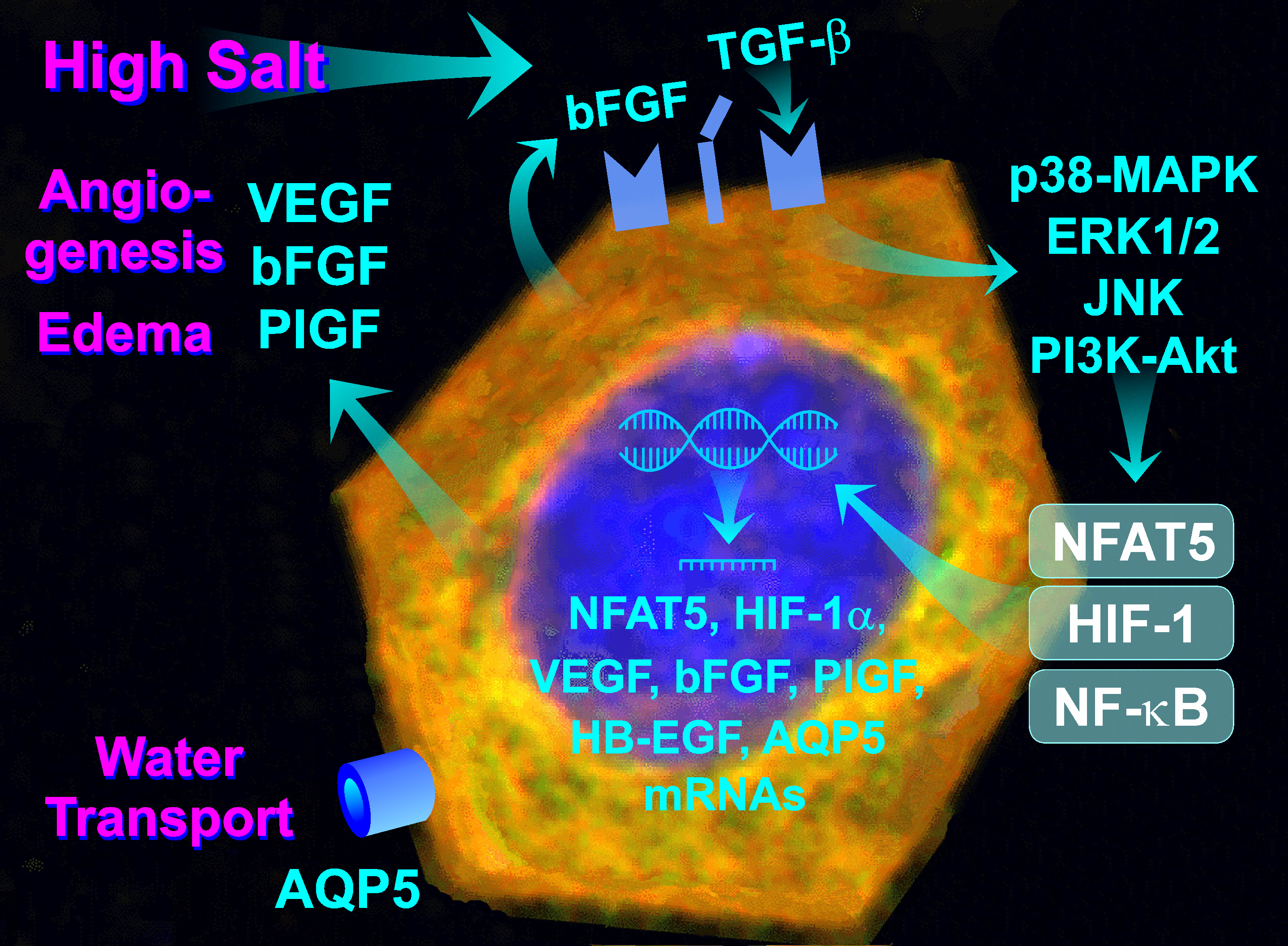 NFAT5 and HIF-1 induce the transcription of the VEGF gene, while NFAT5 and NF-κB induce the transcription of the AQP5 gene. NFAT5 also induces expression of the bFGF gene. The salt-induced secretion of VEGF, bFGF, and placental growth factor (PlGF) may stimulate the development of the central