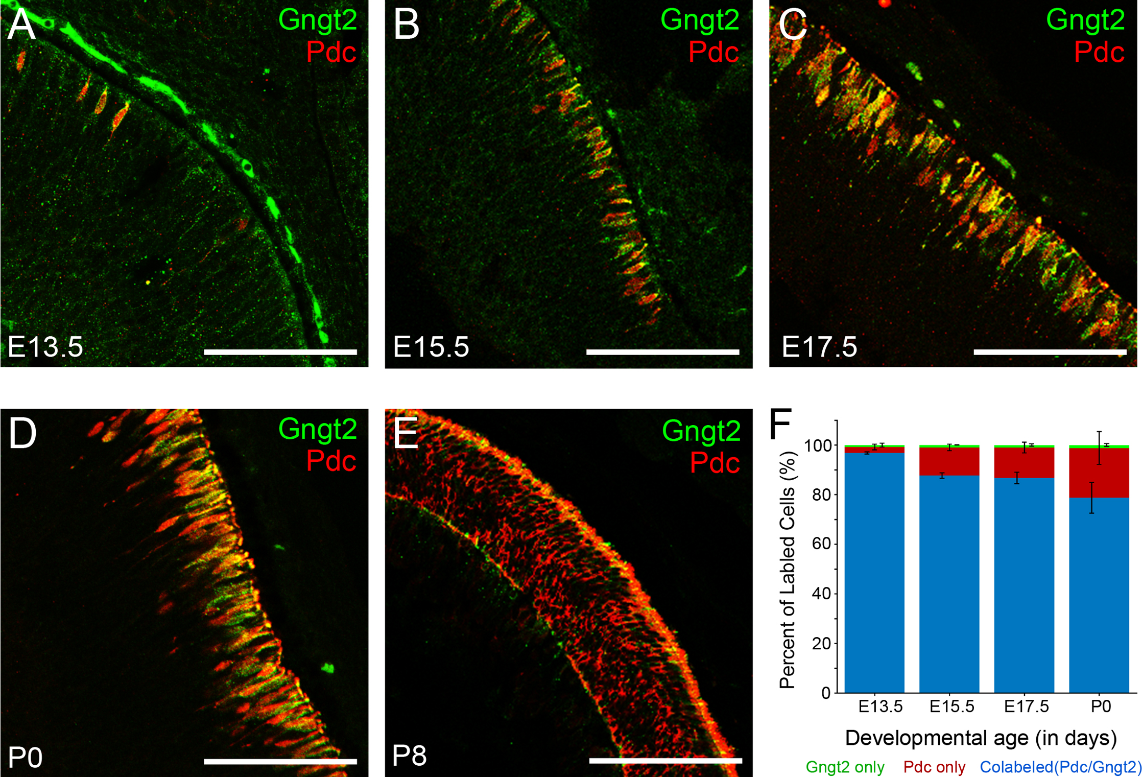 1% ±0.4% at E17.5, and 1.2% ±0.7% at P0. The blue bars indicate cells that are colabeled, the phosducin-only cells are shown