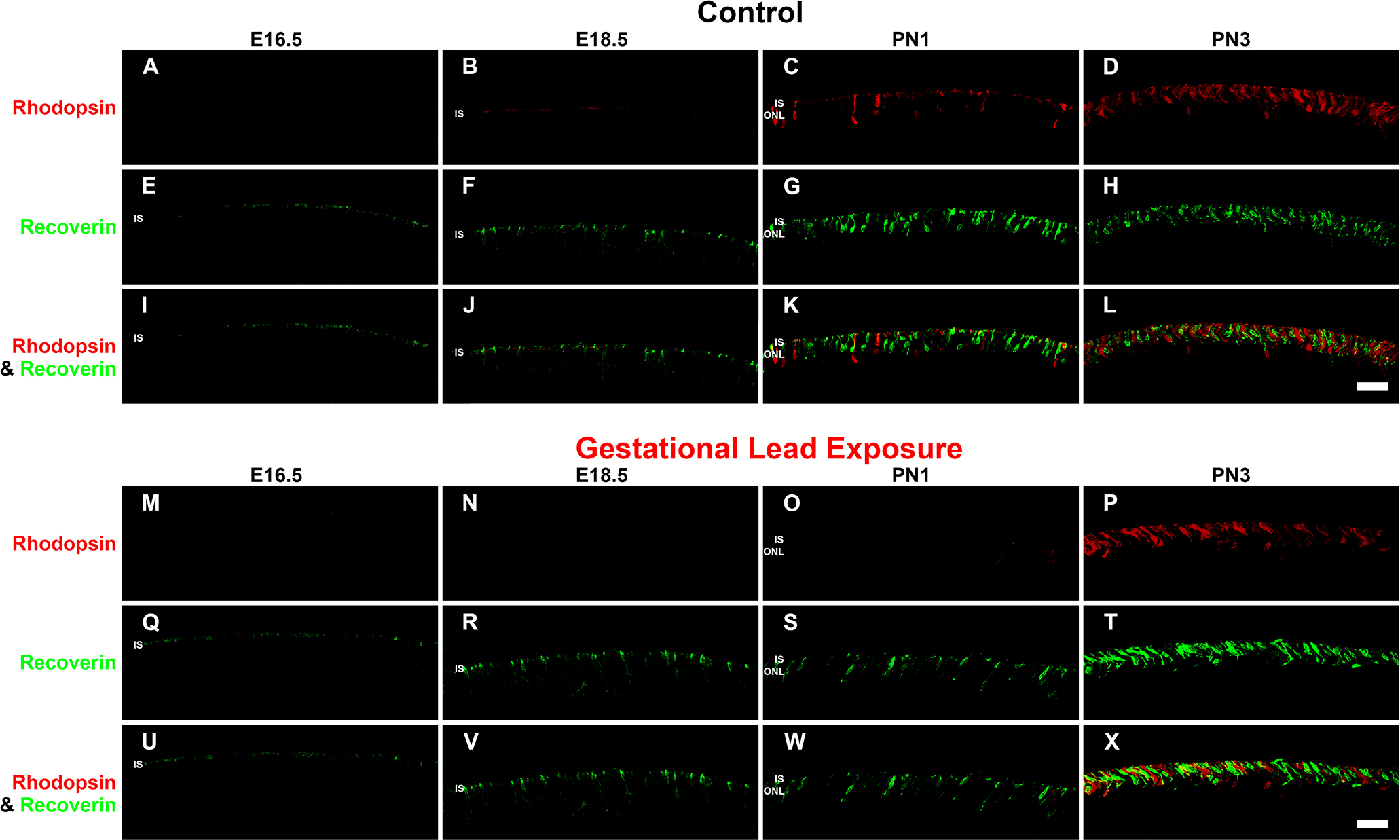retinas. Scale bar = 40 μm. GLE = Gestational lead exposure; IR = immunoreactivity; E = embryonic; PN = postnatal; IS = inner