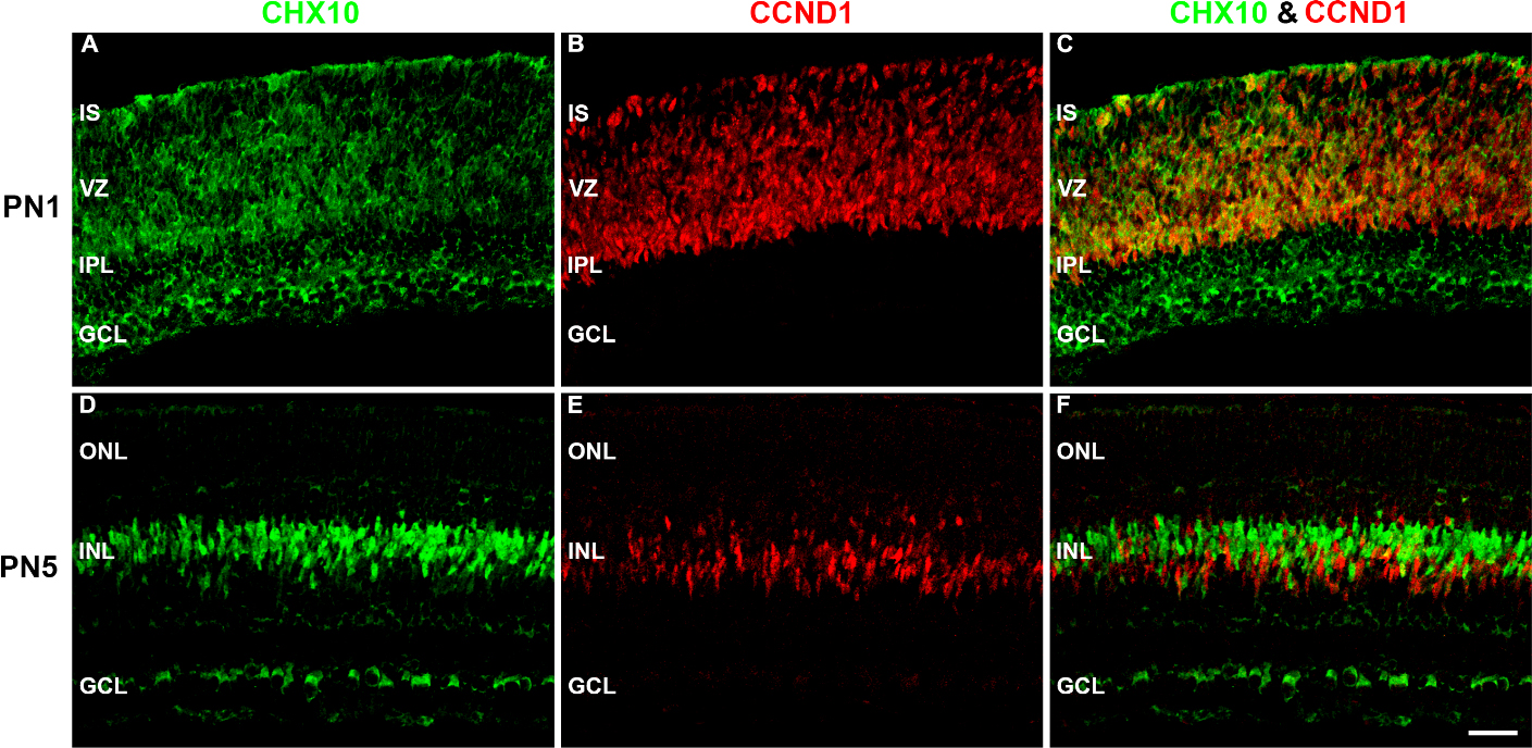 Figure 8. Chx10 colocalized with CCND1 before BC differentiation. The developing (A–C) PN1 and (D–F) PN3 control retinas double labeled with antibodies against Chx10 (green: A and D) and CCND1 (red: B and E), and colabeling was examined in the merged images (yellow: C and F). A: In the PN1 controls, Chx10-IR was diffusely located throughout the retina in the cytosolic compartment. B: CCND1, a cell cycle protein, was localized in the nucleus of the proliferating cells in the VZ. C:Chx10-IR colocalized with CCND1-IR in the VZ. D: In the PN5 control retinas, Chx10-IR was localized in the somas in the INL and the cytosol of cells in the ganglion cell layer. The shape of the Chx10-IR in the INL cells changed from spindly to compact and round. E: CCND1 localized to spindly proliferating cells in the INL. F:Chx10 did not colabel with CCND1 in the INL. Scale bar = 40 μm. CCND1 = cyclin D1; BC = bipolar cell; PN = postnatal; VZ = ventricular