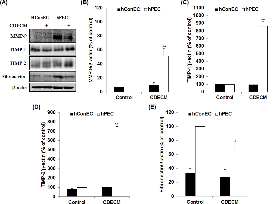 of MMP-9 (B), TIMP-1 (C), TIMP-2 (D), and fibronectin (E), compared with the untreated human pterygium epithelial cells (hPECs). β-actin was used as the control. Values are mean