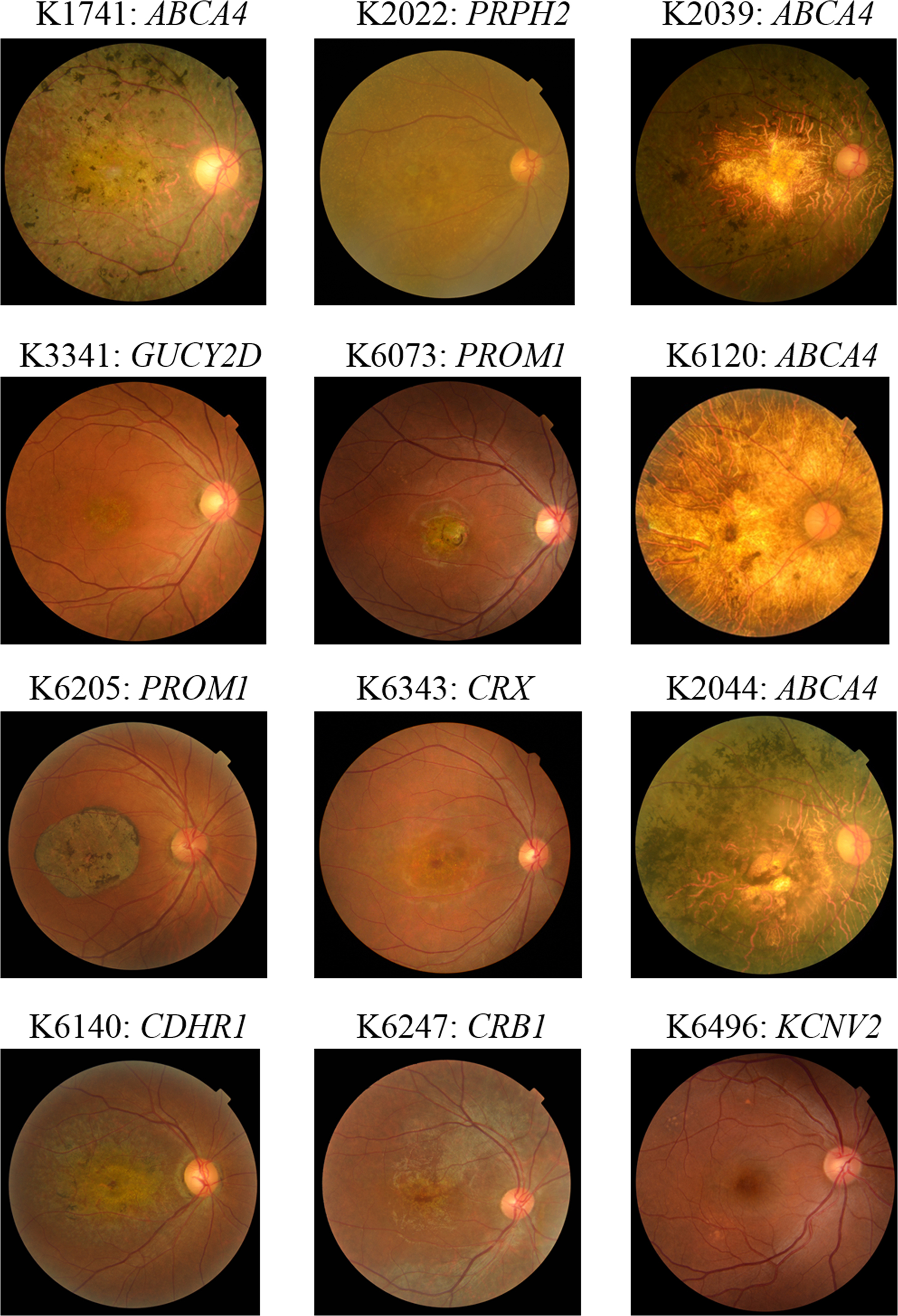 Color fundus photographs of the patients with cone or cone-rod dystrophy carrying pathogenic mutations.