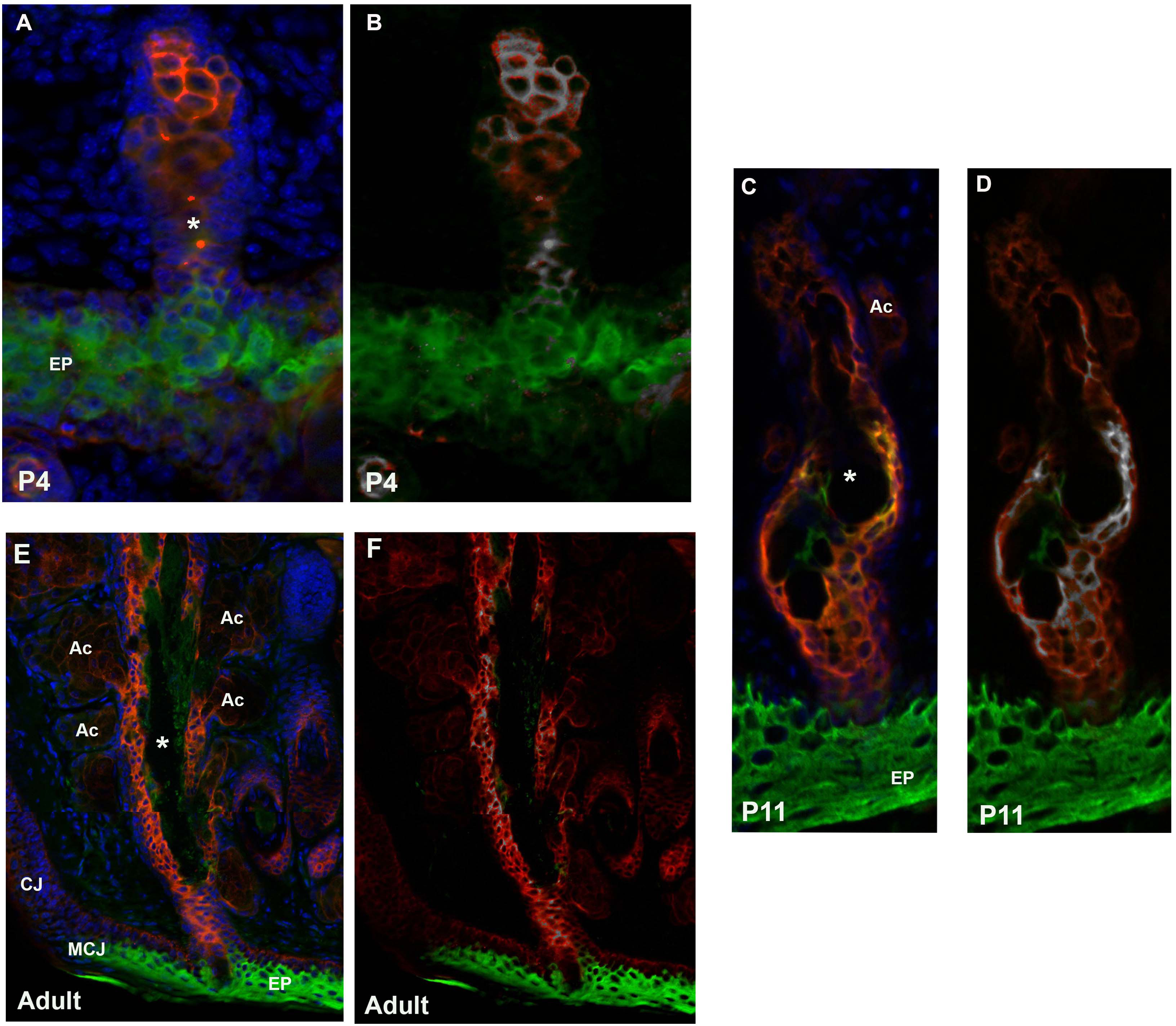 are shown in white at P4 (B), P11 (D) and adult (F). At P4, colocalization of Krt4 and Krt10 is found in the developing central duct as well as the distal gland region. By