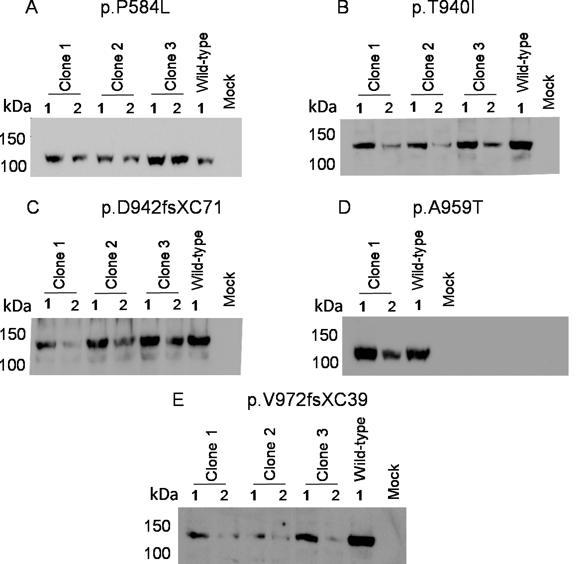 Three clones each of the recombinant EPHA2-Myc carrying A: p.P584L, B: p.T940I, C: p.D942fsXC71, and E: p.V972GfsX39 mutation and a clone carrying D: p.A959T mutation show protein of the expected size (∼130 kDa). Cells transfected with the wild-type EPHA2-Myc construct were used as a positive control. Protein extracts of mock transfected cells were used as a negative control. Masses