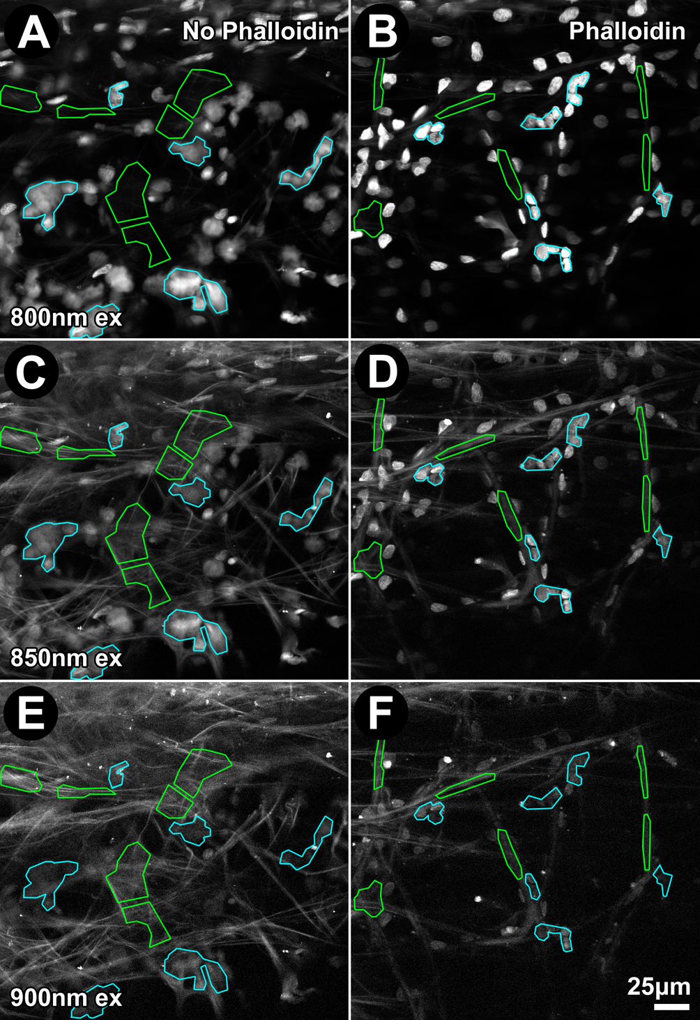 (AF) intensity. Two tissue sections from the same donor were fixed and incubated without (A, C, E) or with Alexa-568-conjugated phalloidin (B, D, F) and imaged. Emission from the uveal meshwork following 2P excitation at 800 nm (A, B), 850 nm (C, D), and 900 nm (E, F) was captured through a green filter (500–550 nm). Region-of-interest (ROI) analysis of AF (green) and Hoechst 33342 nuclear