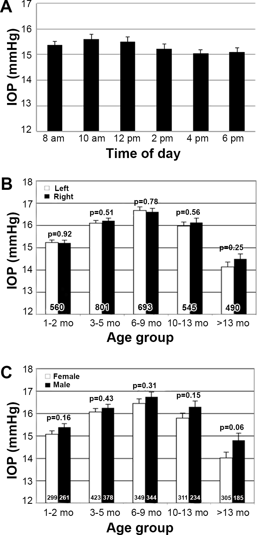 between 8 AM and 6 PM (p>0.05; n = 5 mice at each time of day). B: The elevated IOP phenotype in the BXD mice is independent of sidedness. Within each age cohort, no significant difference