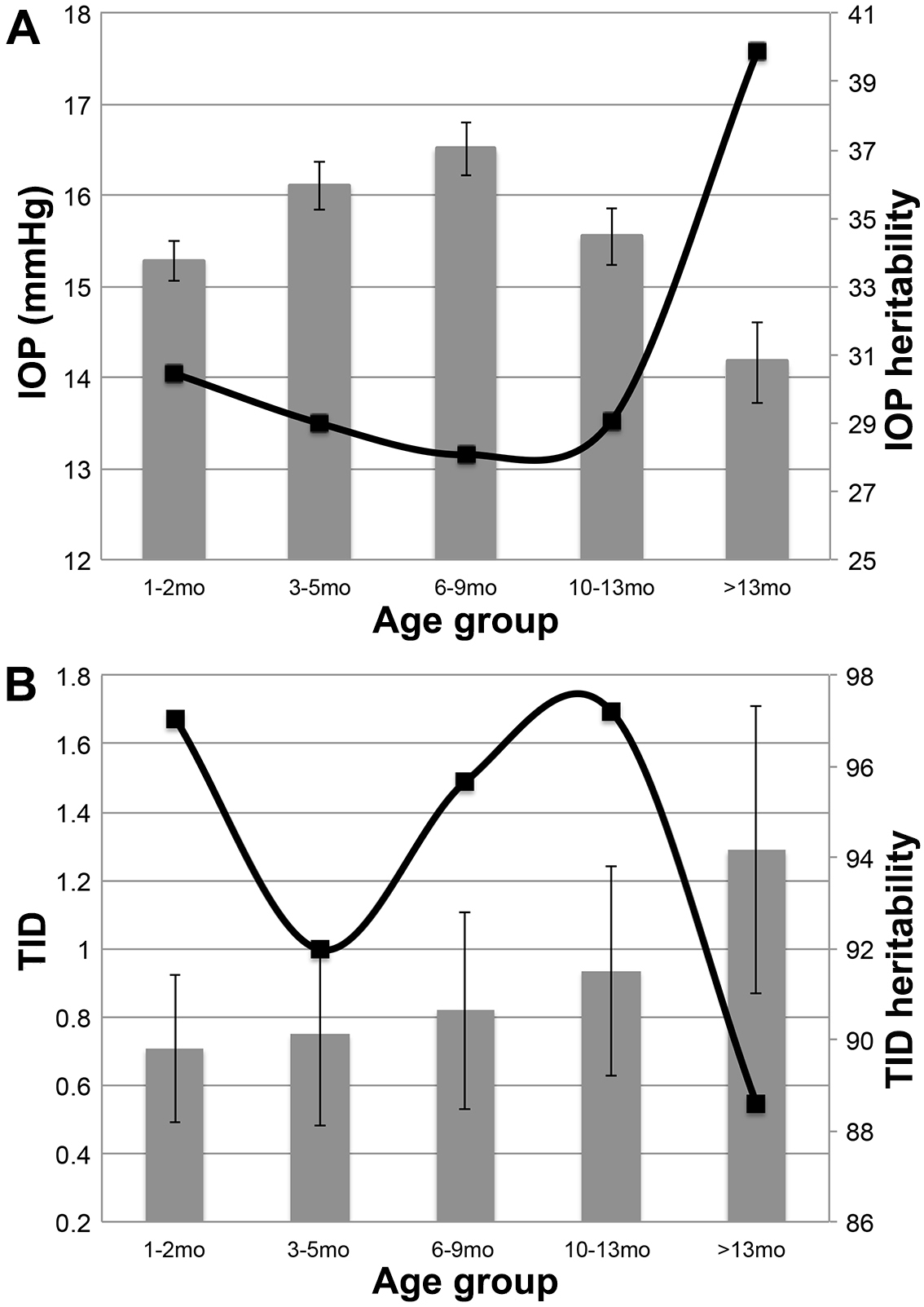 Figure 2. High IOP and TID phenotypes differ in age of peak phenotype expression. A: Intraocular pressure (IOP) values increased with age until the 6- to 9-month-old cohort and then progressively decreased