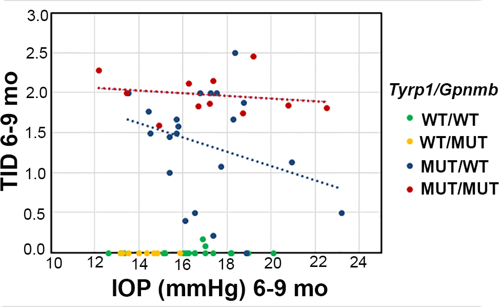 BXD murine strains when they are stratified based on the Tyrp1/Gpnmb genotype. Some strains that are wild-type at Tyrp1 and Gpnmb (green symbols) developed high IOP but showed negligible TID. However, some that are mutant at Tyrp1 and Gpnmb (red symbols) had low IOP values and high grades of TID, thus demonstrating that TID does not directly influence IOP. The