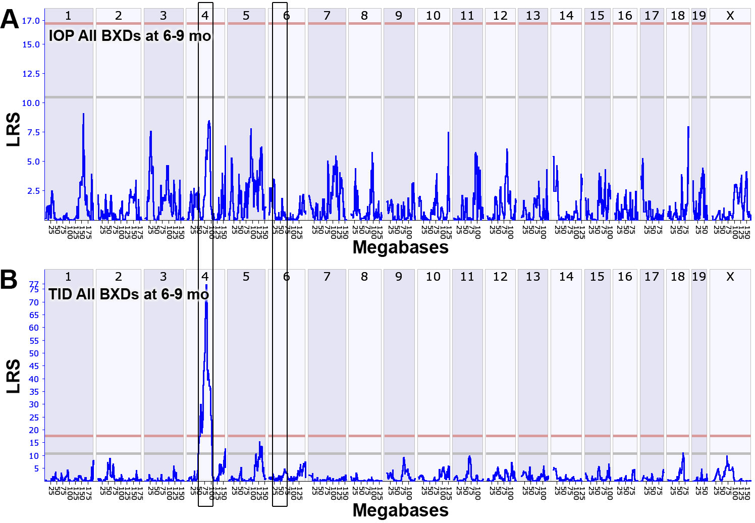 Tyrp1 (left vertical box) or Gpnmb (right vertical box), suggesting that these genes do not modulate IOP in BXD mice. B: In contrast, the transillumination defect (TID) mapped with a high likelihood ratio statistic (LRS) score to Tyrp1 in the 6- to 9-month-old cohort of the BXD strains.