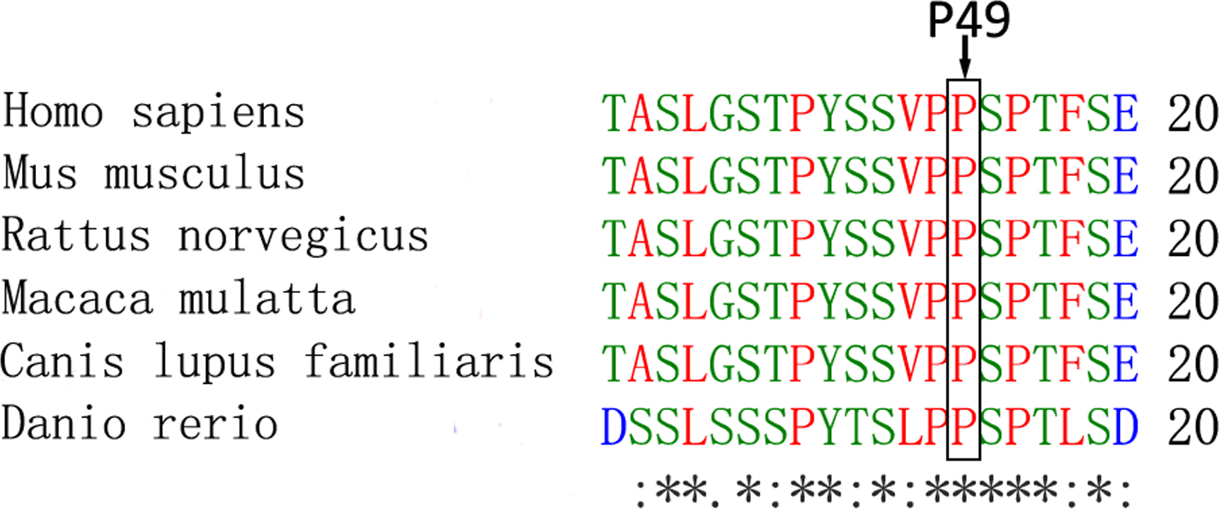 Figure 4. The amino acid sequences alignment of NRL in different species. The box indicates the P49 residue is highly conserved during