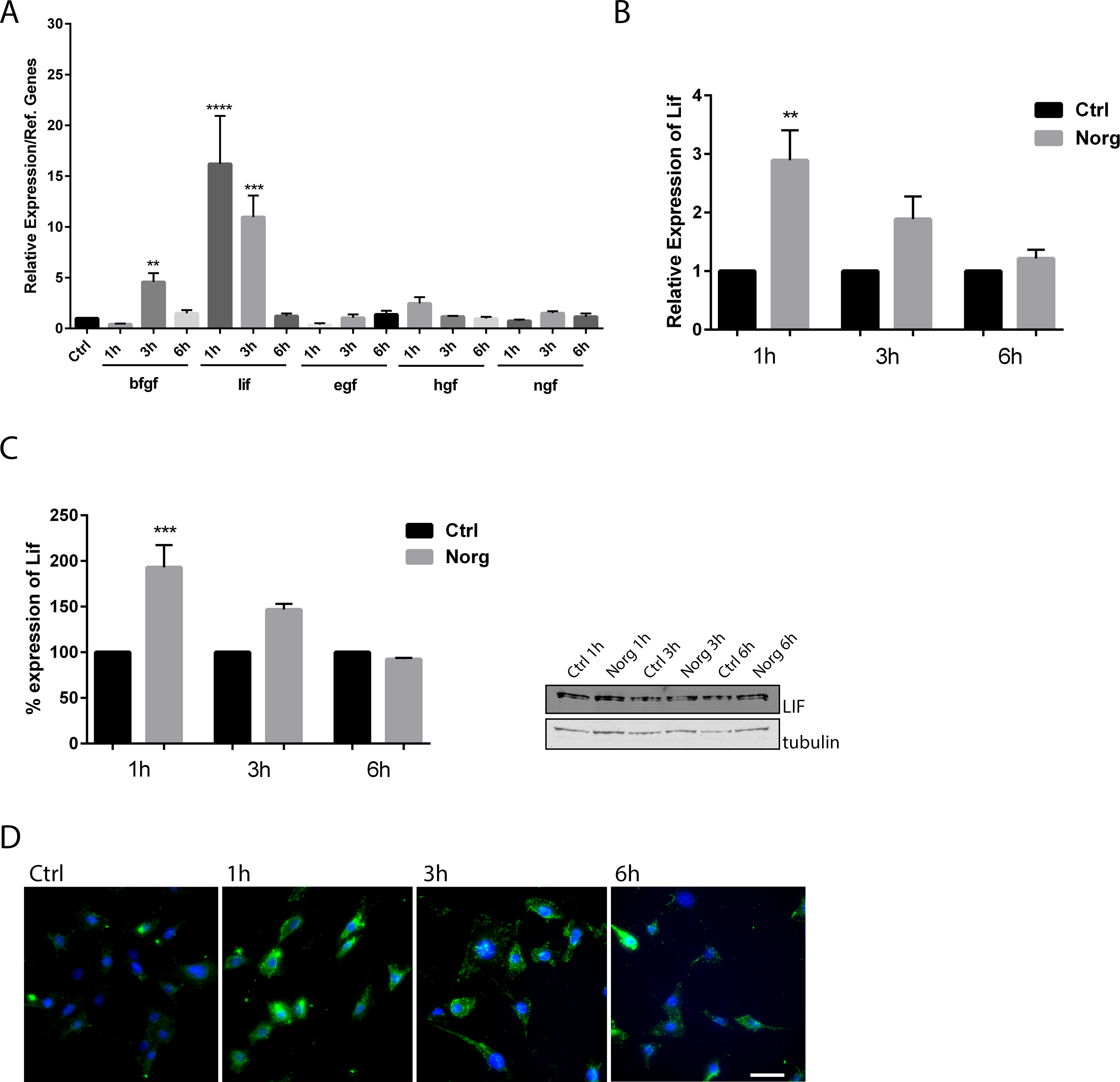 (Lif), epidermal growth factor (Egf), hepatocyte growth factor (Hgf), and nerve growth factor (Ngf), and basic fibroblast growth factor (bFGF) following 20 µM norgestrel treatment for the times shown or vehicle control (ctrl) for 6 h. B: Relative expression of Lif in 661W cells treated with 20 µM norgestrel or vehicle control for the times indicated. For A and B, relative expression was analyzed with real-time (RT) PCR, with the fold change compared to the geometric mean of the three