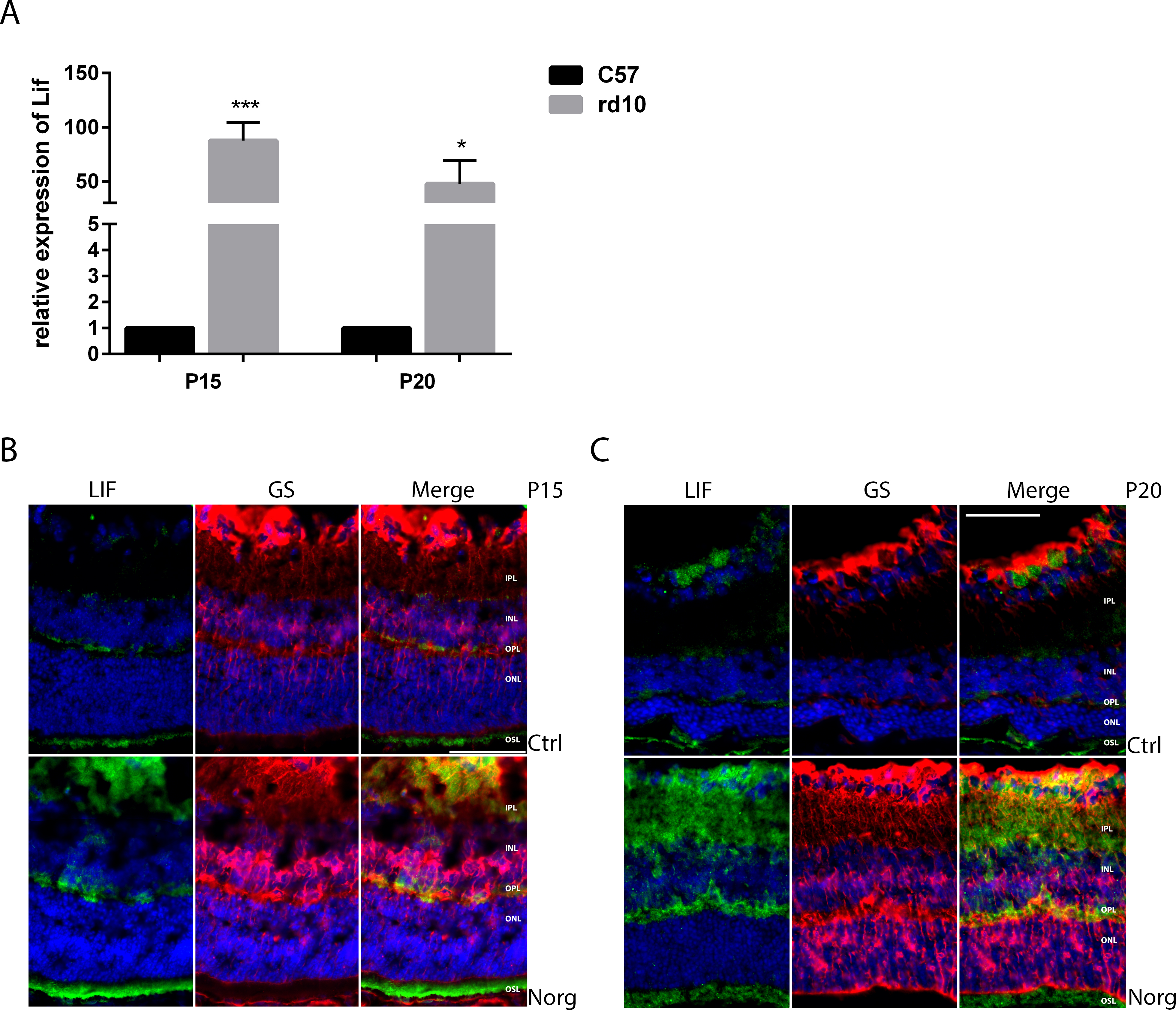 standard error of the mean (SEM). B and C: Immunostaining of LIF (green) and glutamine synthetase (GS; red) in rd10 retinas at P15 (B) and P20 (C). Increased LIF levels are observed in mice that received the norgestrel diet (lower panels) during retinal degeneration,
