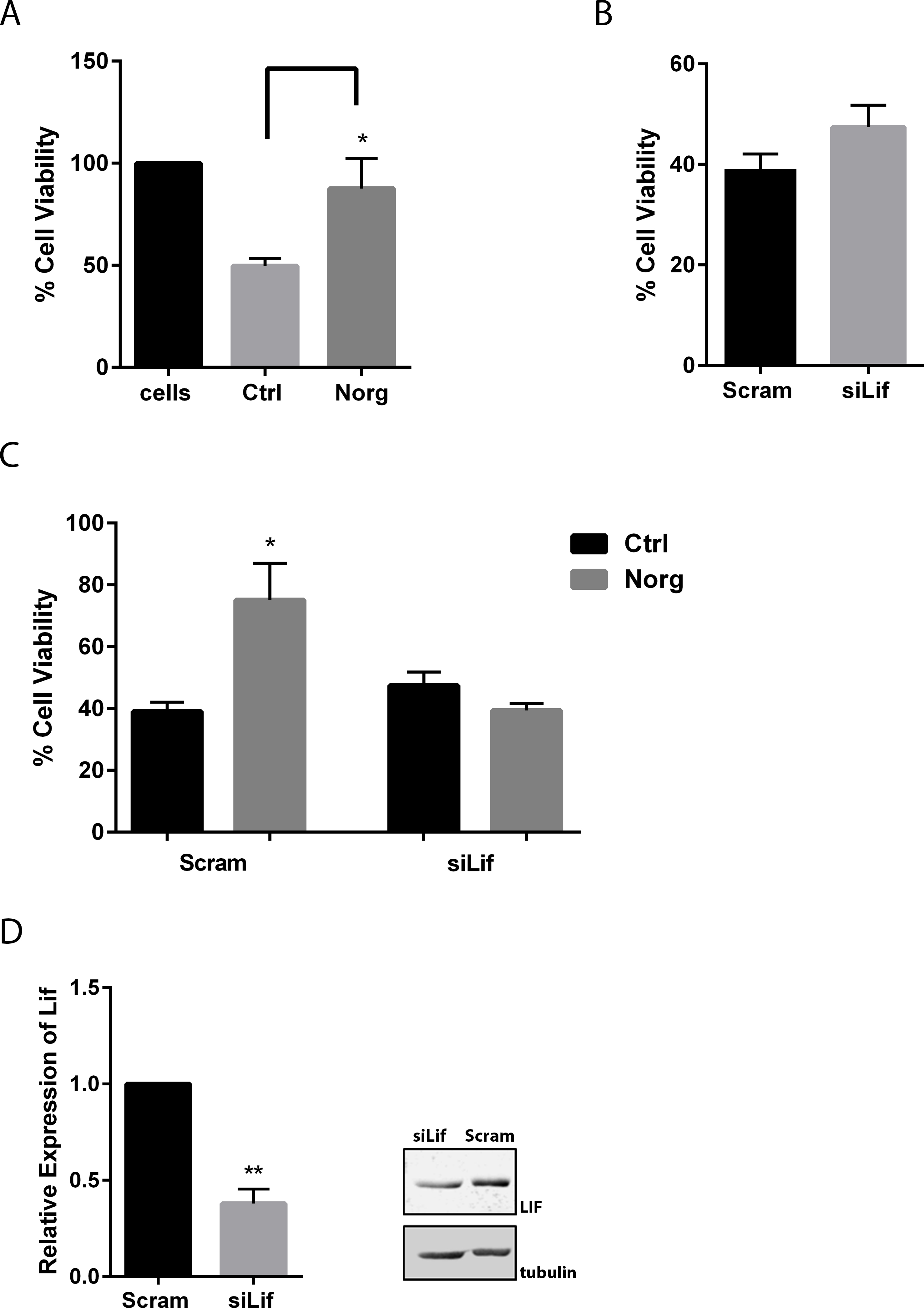 (Norg) or vehicle control (ctrl). D: Detection of Lif knockdown with real-time (RT) PCR (left) and western blotting (right). Error bars denote