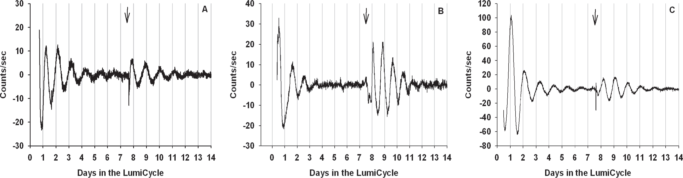 Figure 2. Mouse Müller cells exhibit molecular circadian rhythms. A: Bioluminescent rhythms recorded from Müller cells cultured from PER2::LUC mice. B: Bioluminescence rhythms from WT C57 mouse Müller cells transduced with Per2::luc lentivirus. C: Bioluminescence rhythms from WT C57 mouse Müller cells transduced with Bmal1::luc lentivirus. Arrows indicate the introduction of the new culture medium.