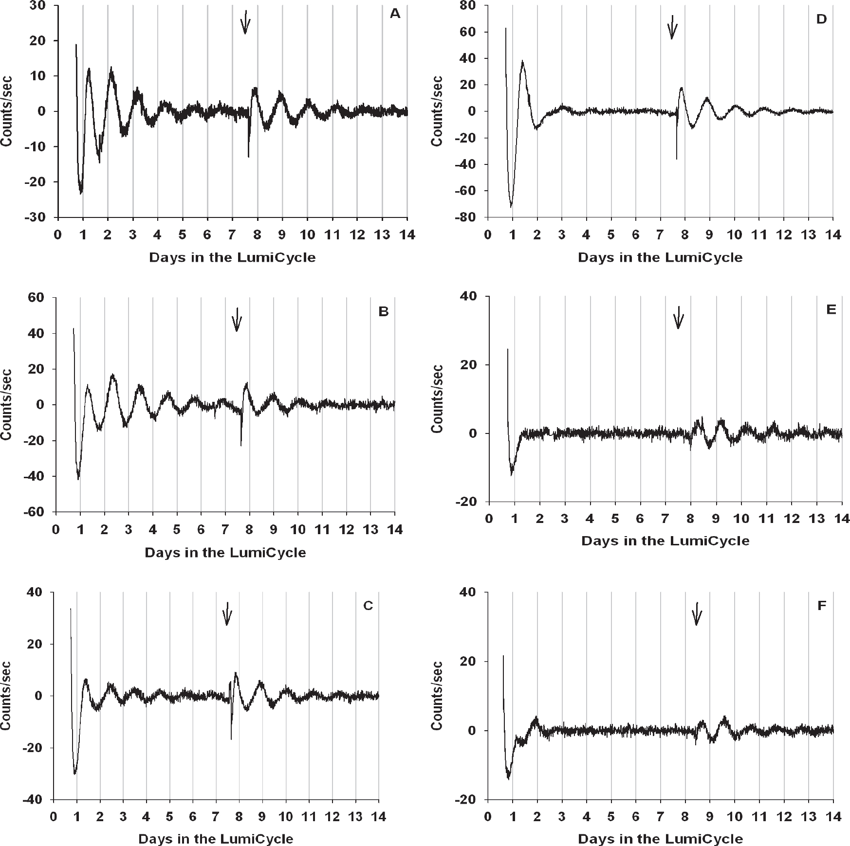 Figure 4. Mouse Müller cell PER2::LUC rhythms depend on ongoing Per1 and Bmal1 expression. A: Bioluminescent rhythms recorded from the Müller cells cultured from PER2::LUC mice. B: PER2::LUC rhythms from the Müller cell cultures treated with control siRNA. C: PER2::LUC rhythms from the Müller cell cultures treated with the Lipofectamine transduction reagent. D: Loss of PER2::LUC rhythms from the Müller cell cultures treated with Per1 siRNA. E: Loss of PER2::LUC rhythms from the Müller cell cultures treated with Per2 siRNA. F: Loss of PER2::LUC rhythms from the Müller cell cultures treated with Bmal1 siRNA. Arrows indicate the introduction of the new culture medium.
