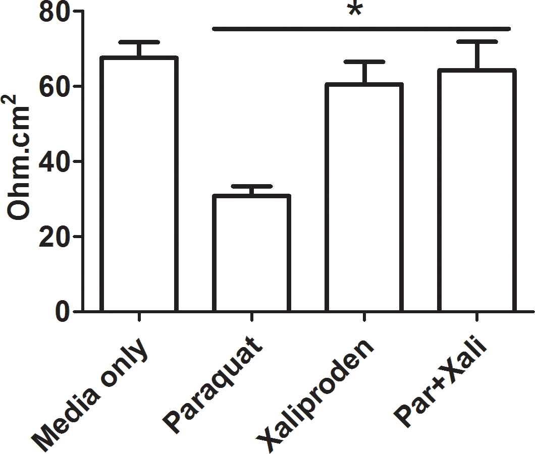 Figure 2. Xaliproden protects against the loss of tight junctions in the presence of paraquat. ARPE-19 cells were seeded in 24 Transwell