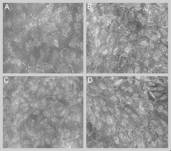 and viewed in a fluorescence microscope. A: Paraquat alone. B: Paraquat plus xaliproden. C: TNF-α alone. D: TNF-α plus xaliproden.