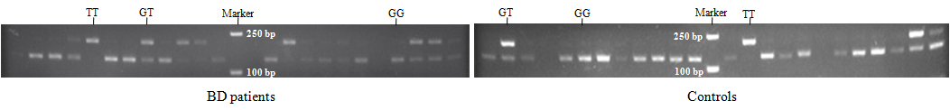 The TT genotype shows one band at 206 bp, and the TG genotype shows three bands at 206 bp,124 bp and 82 bp, whereas the GG genotype shows two bands at 124 bp and 82 bp. To access the data, click or select the words “Appendix 1.”