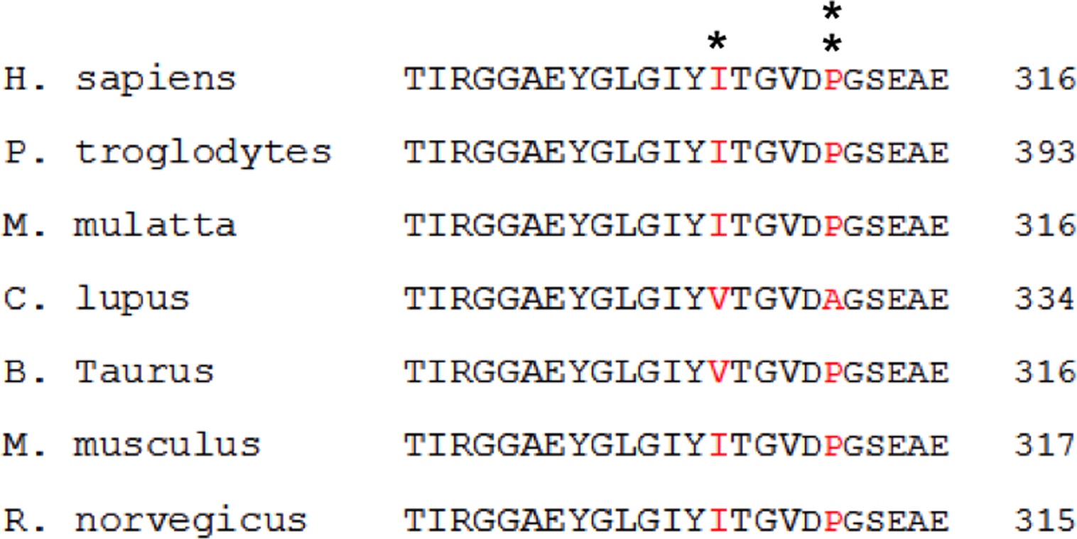 324 of the canine DFNB31 and proline or alanine (marked by double asterisks) at position 329.