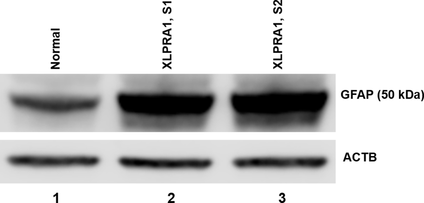 Figure 4. Representative western blot analysis for GFAP on two XLPRA1-affected retinas (S1 and S2, 16 weeks) versus the age-matched