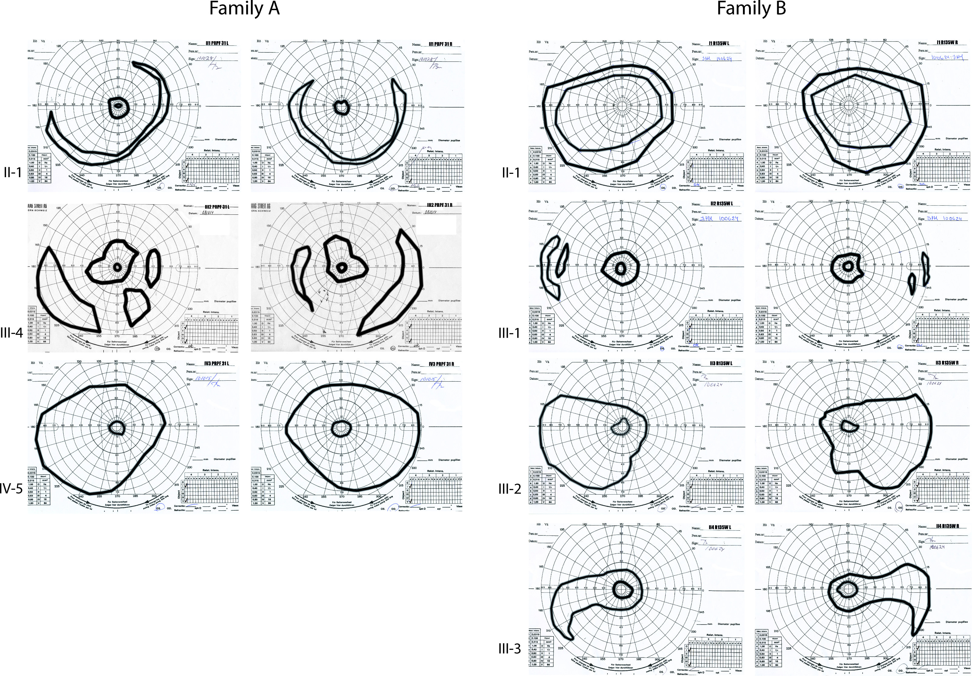 Figure 2. Phenotype. A: Visual fields in Family A with the PRPF31 (p.IVS6+1G>T) mutation, demonstrating an age-correlated loss of visual field. B: Visual fields in Family B with the RHO135 (p.R135W) mutation, showing normal visual fields in patient II-1 and variable loss in the visual field in her three children.