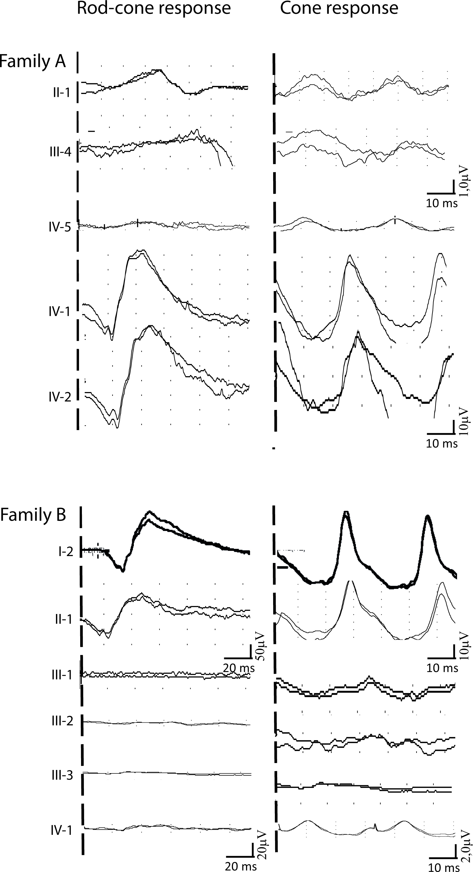 Figure 5. Phenotype. Results of full-field electroretinography. Family A with the PRPF31 (p.IVS6+1G>T) mutation showed a severely reduced rod and cone response in the affected individuals (II-1, III-4, and IV-5),